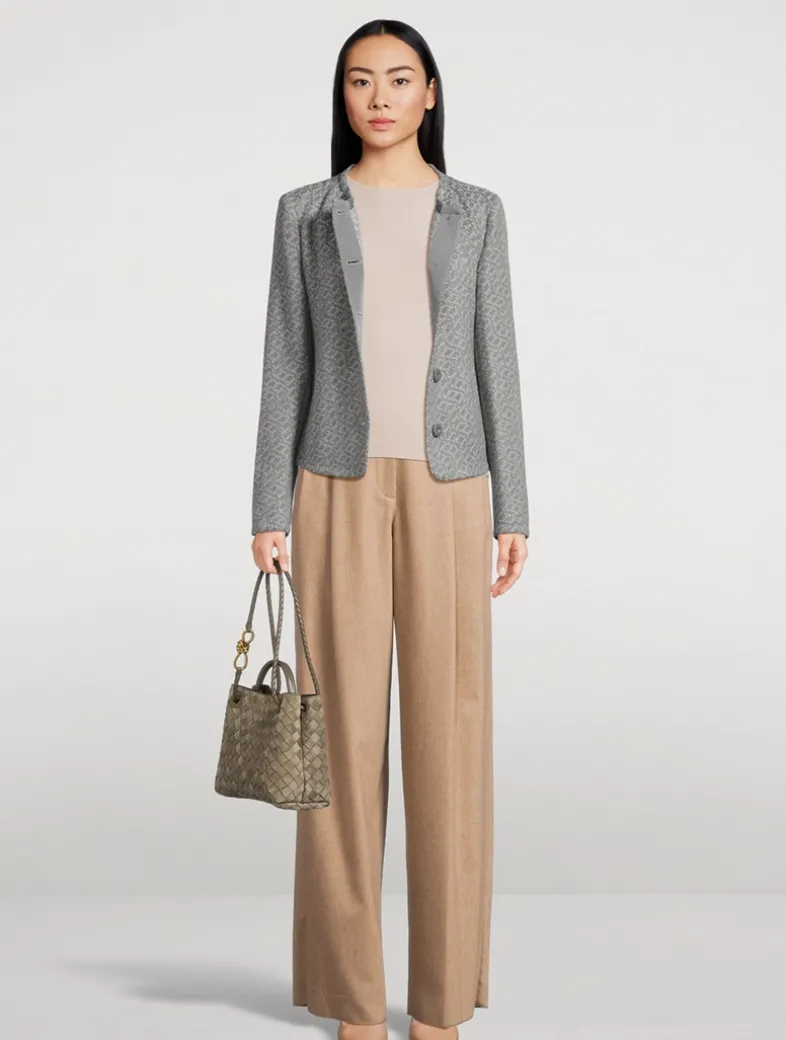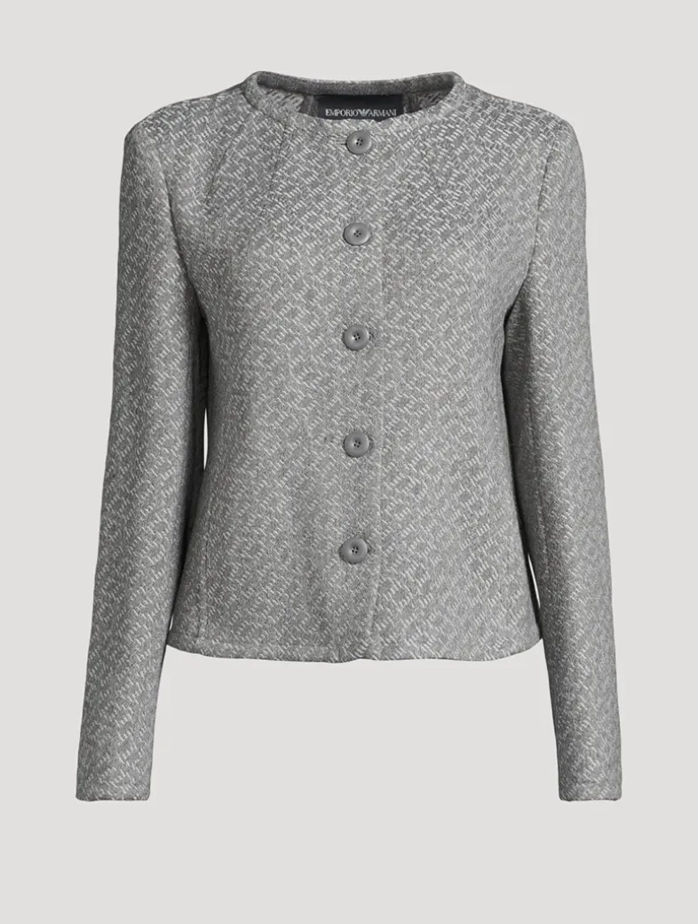 This collarless jacket is made of a jacquard knit featuring a tricot-effect weave is embellished with a distinctive micro-pattern. The garment is part of the Icon capsule collection.