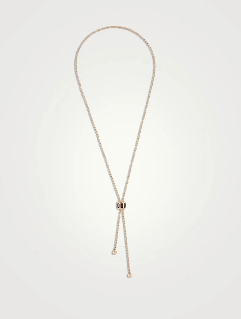 Exhibiting half a century of savoir-faire, the Iconica collection is an homage to Pomellato’s fine goldsmithing skills and Milanese roots. The open chain of this lariat-style necklace is held together with an adjustable gold slider covered in gems. This innovative sliding system has a versatile all-gold mechanism that glides over the delicate chain allowing different ways to wear the necklace.