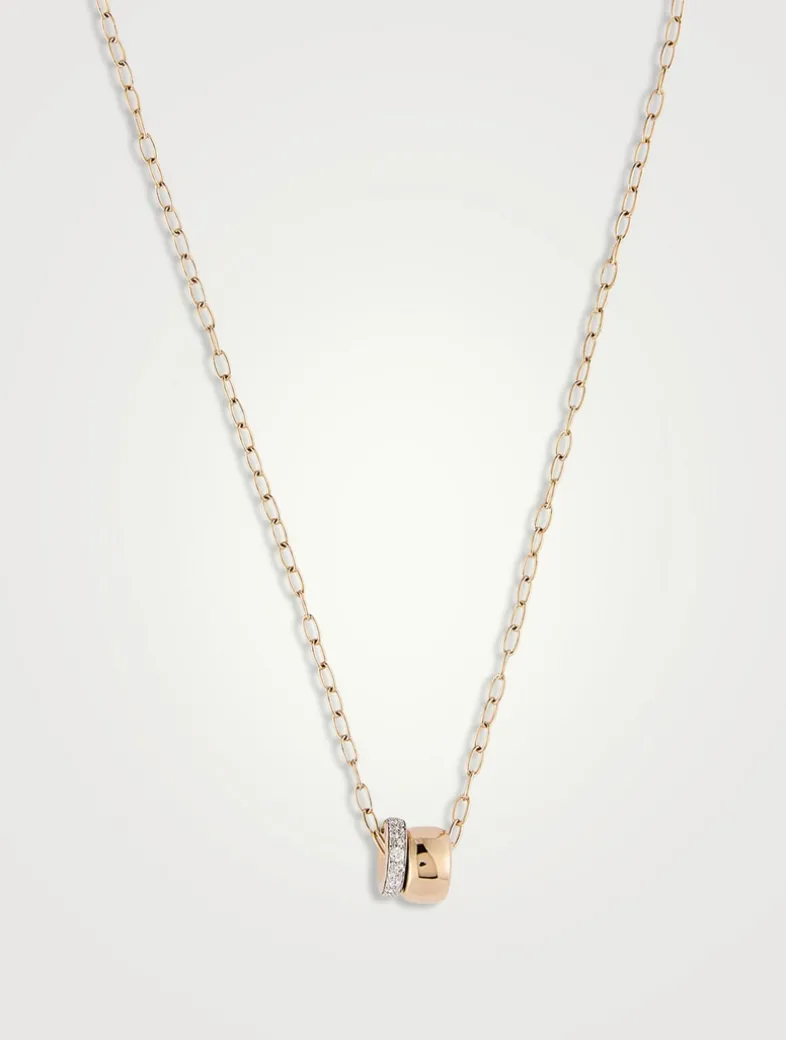 Exhibiting half a century of savoir-faire, the Iconica collection honours POMELLATO’s fine goldsmithing skills and Milanese roots. Set on an open link chain, this necklace features two ring pendants, one fully encrusted with diamonds.