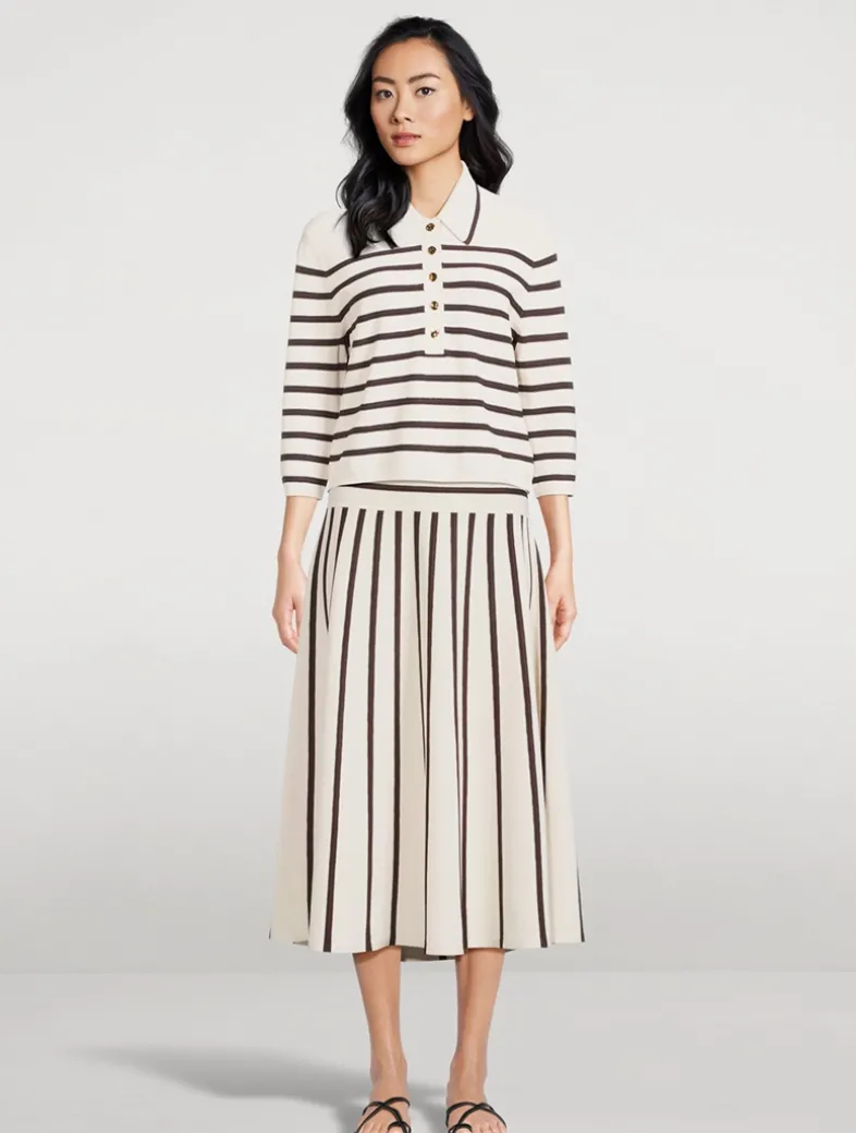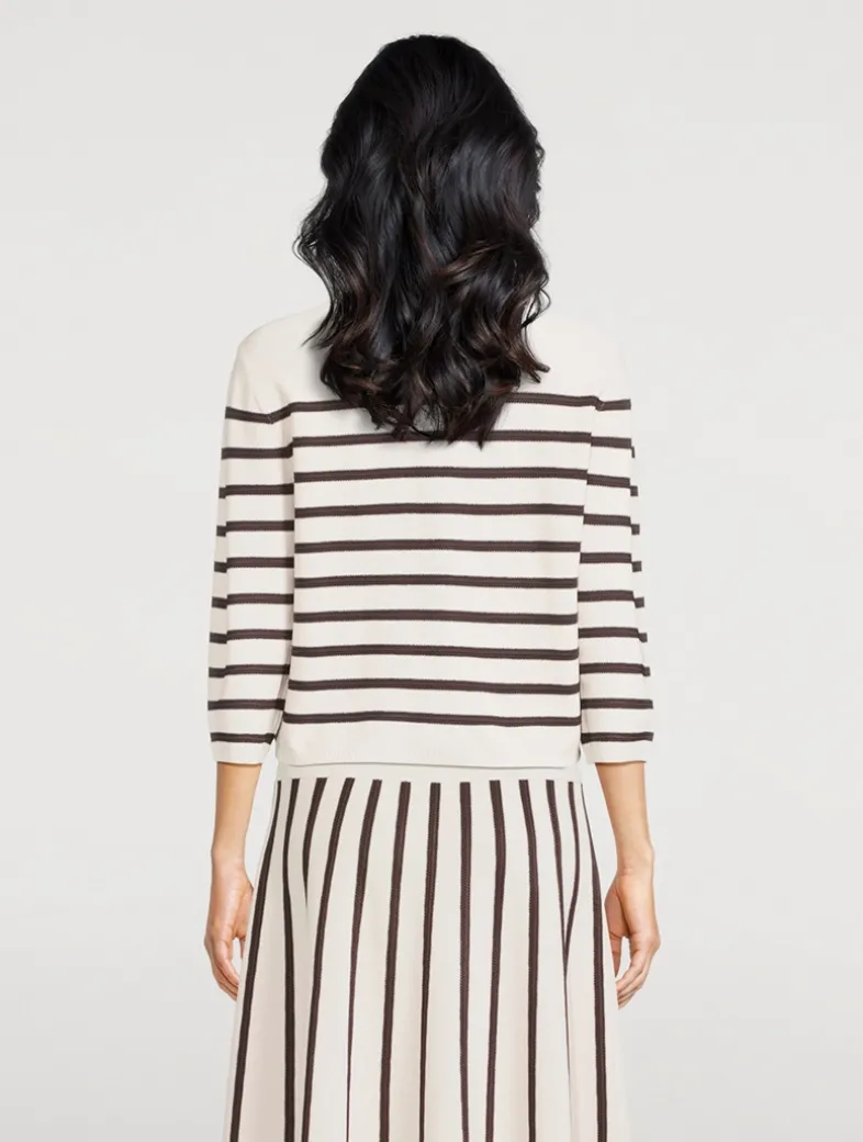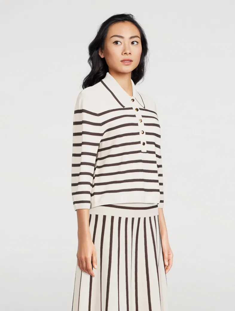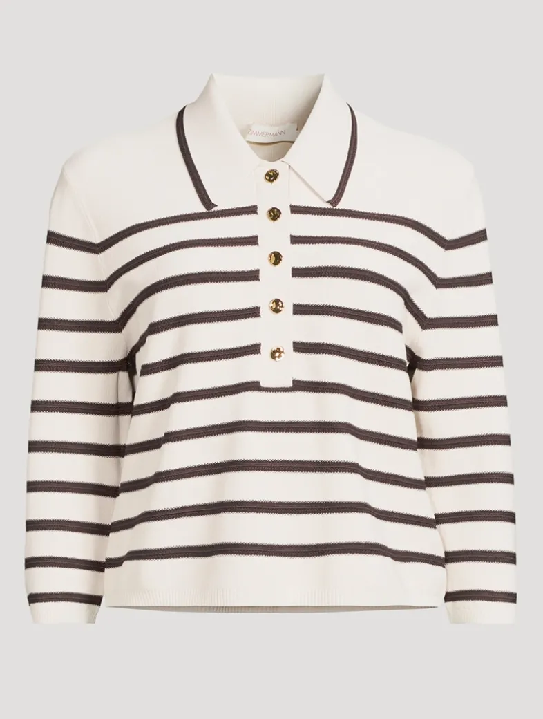 Featuring polo-inspired styling, this knit top is designed with a classic collar and buttons down the top front opening. Nautical stripes completes the look.