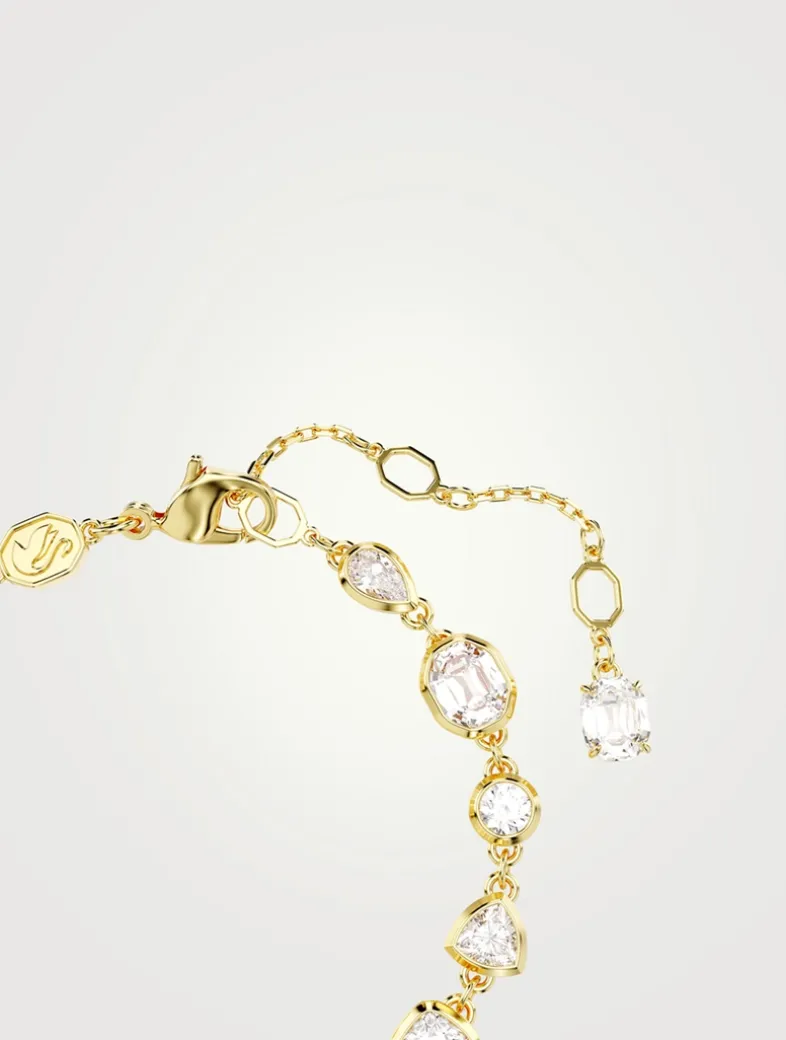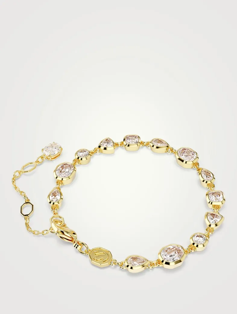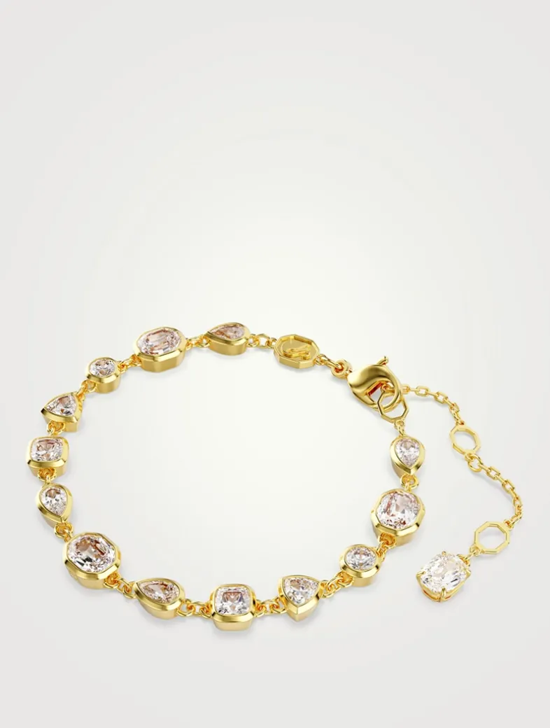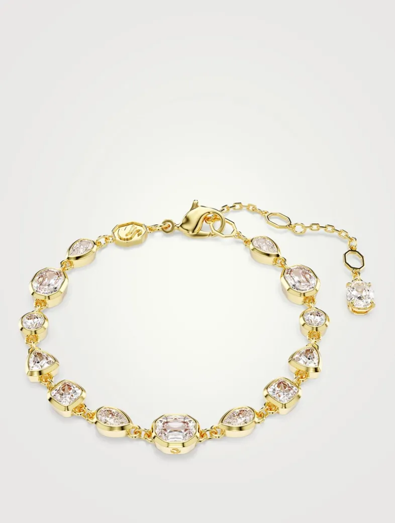 This intriguing gold-tone plated bracelet features a full surround of Swarovski Zirconia, presented in a variety of shapes, with each placed in a modern bezel setting. For an adjustable fit, the lobster closure is accompanied by three size positions, and a single Swarovski Zirconia at the end of the extender.