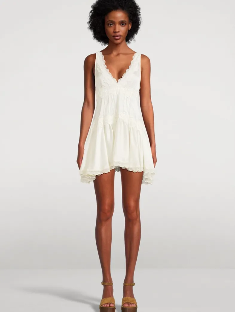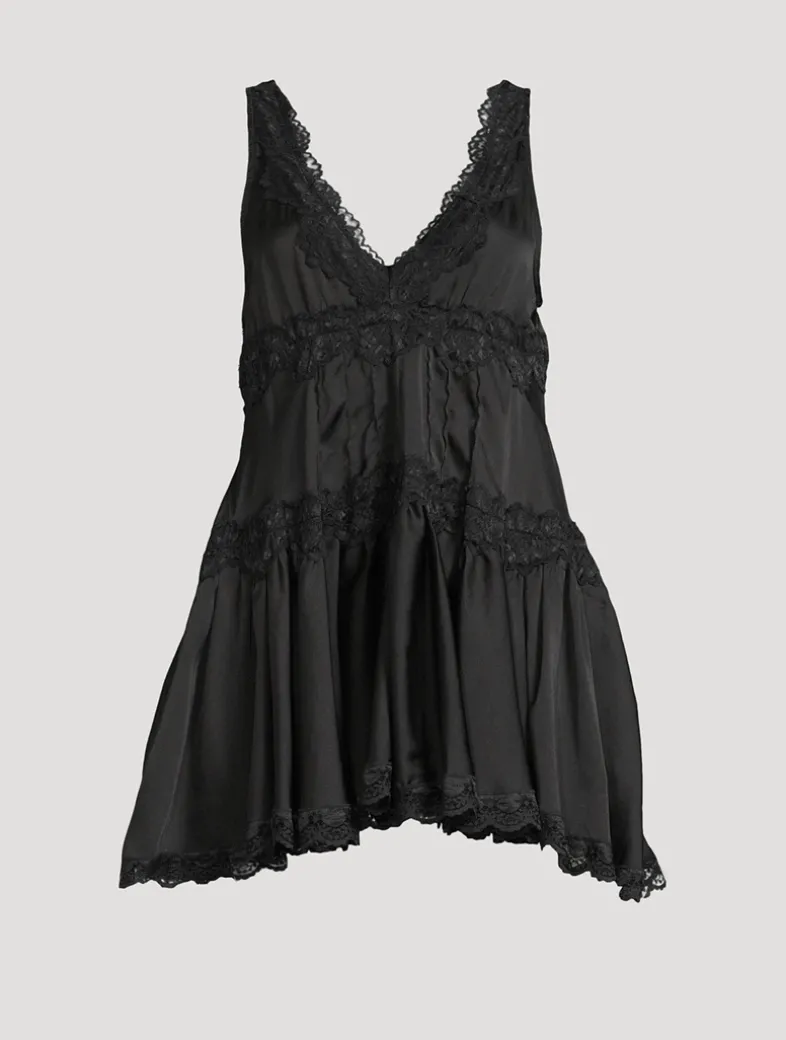 Romance awaits with this floaty slip, featured in a silky, tiered design with delicate lace trim. It is cut to a fluttering silhouette with a plunging neckline and mini-length hem.