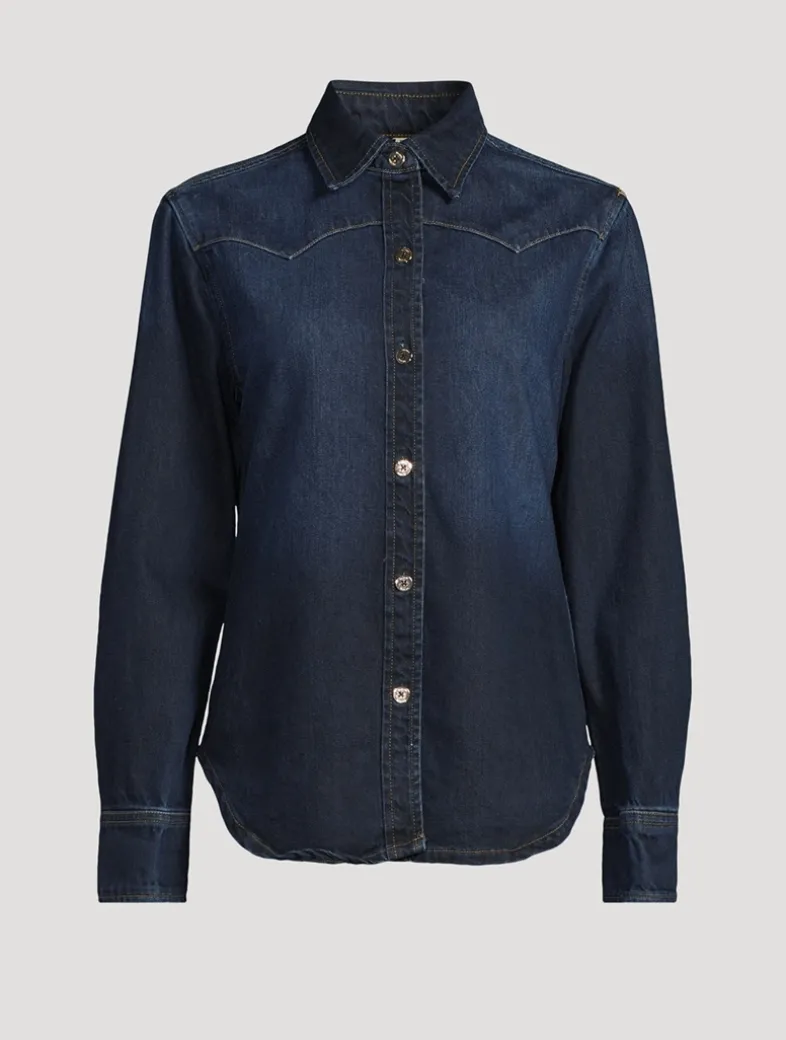 Ines is a tailored button-down shirt with a point collar, a rounded hem, and Western-inspired detailing.