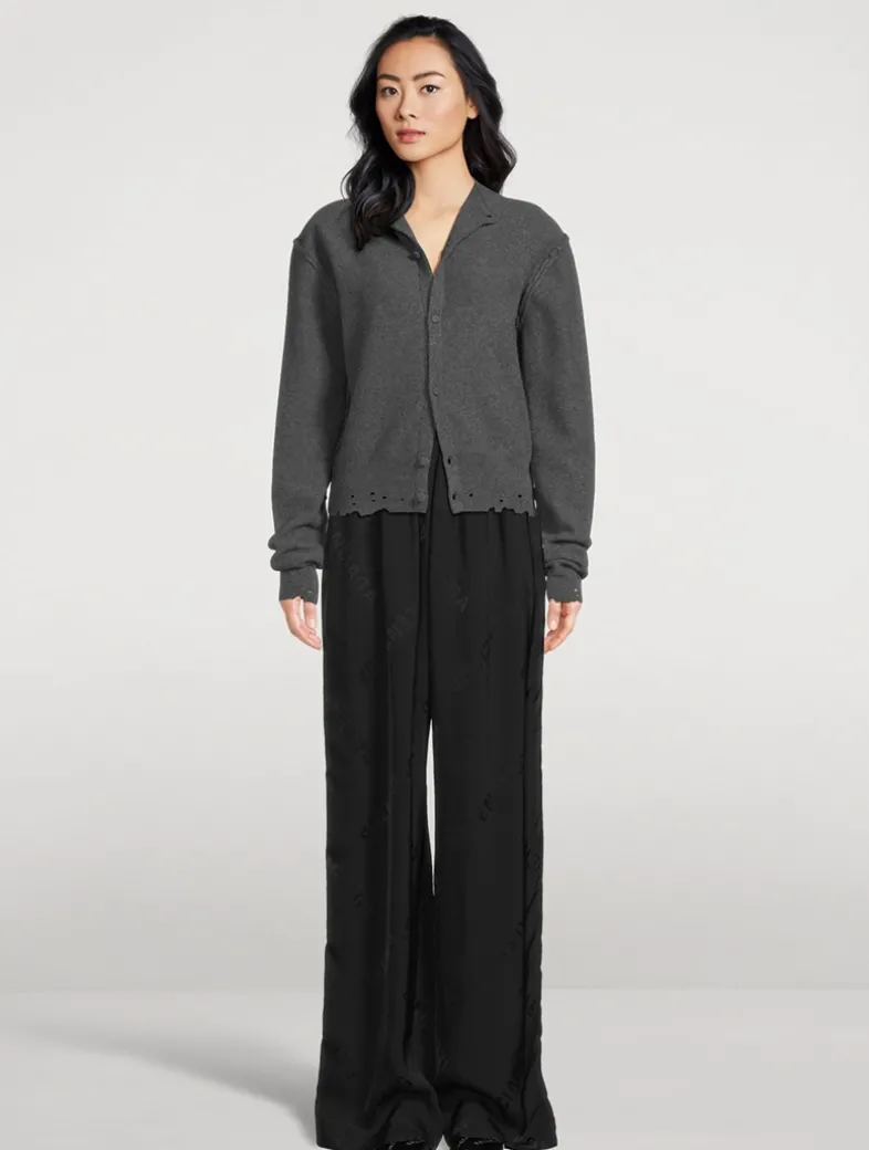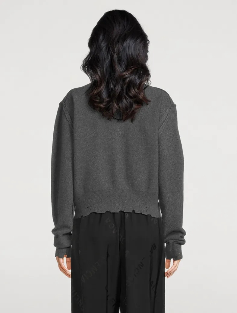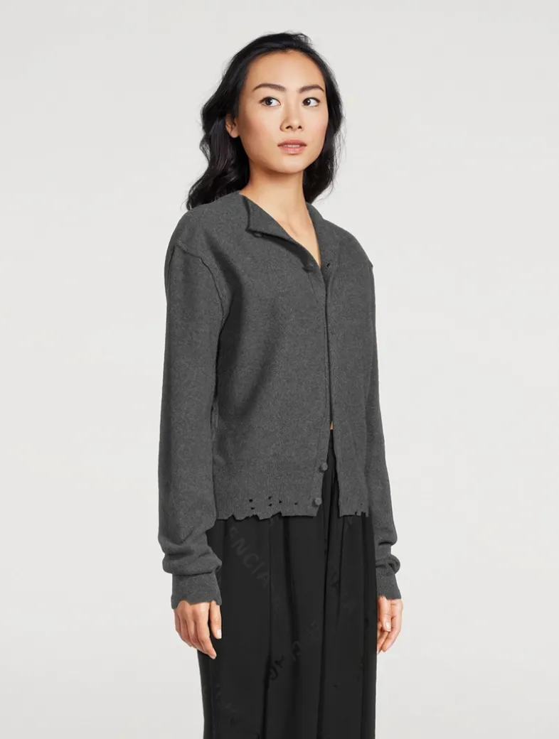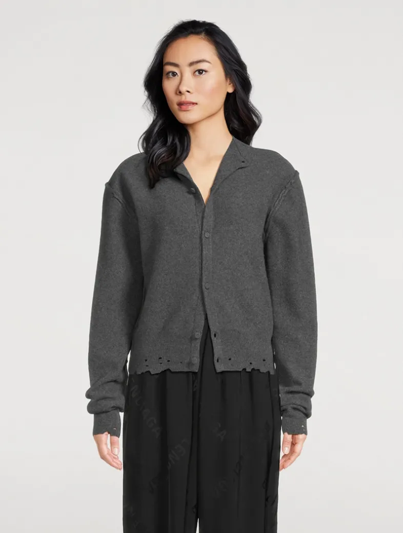 A faux inside-out design lends a playful touch to this cardi. Knit from a mix of cashmere and wool, it has textured seaming at the shoulders and distressed detailing at the cuffs and hem.
