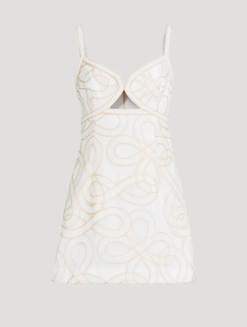 Delicate shimmering embroidery swirls across this mini dress, echoing the metallic sheen of an exposed zipper at the back. It has a keyhole cut-out at the bust and adjustable straps to ensure the perfect fit.
