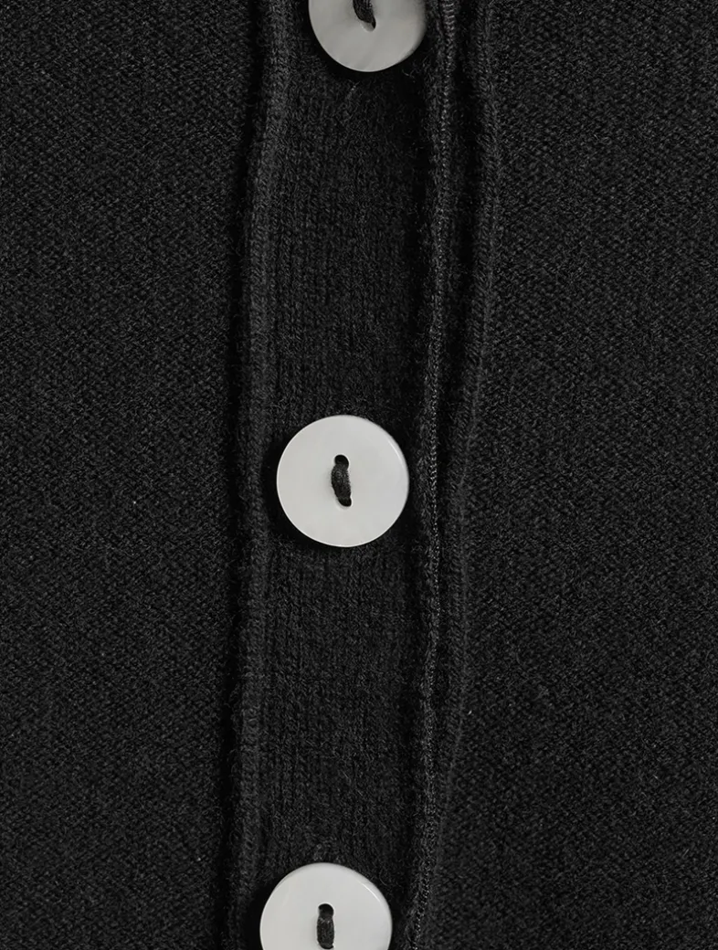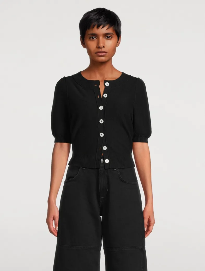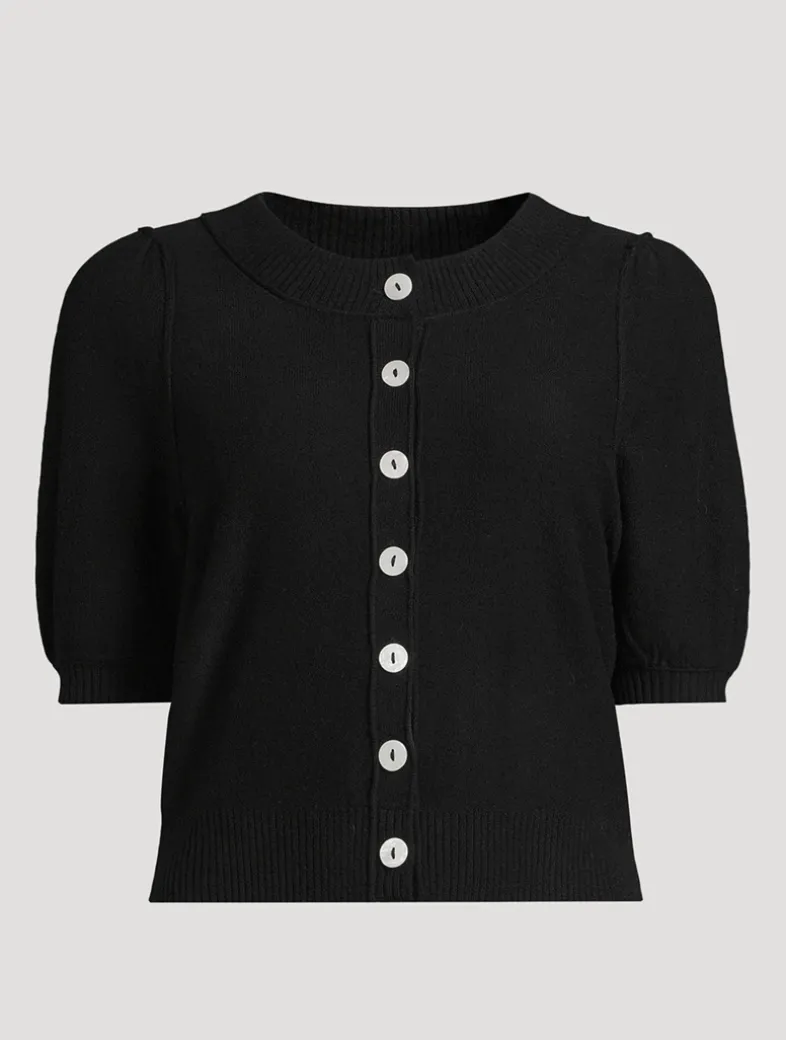 Sweet and classic, this wool-blend knit cardi is featured in a slightly cropped style with puffed short sleeves and pearlescent buttons down the front.