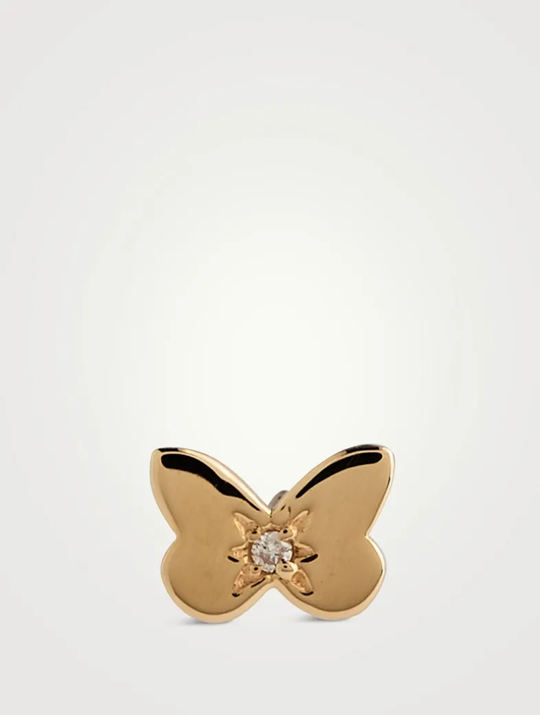 Encrusted with a diamond, this mini butterfly stud earring is mounted on a gold post.