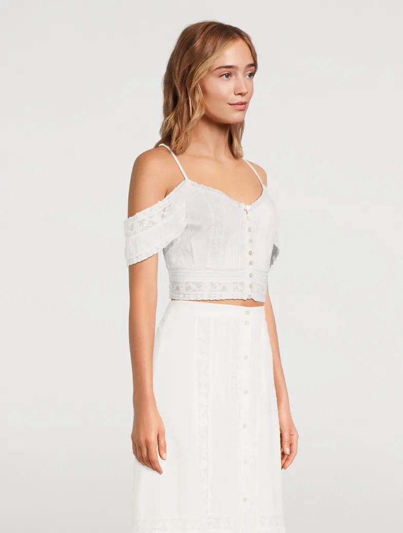 This cropped top debuts with a cotton fabric adorned with intricate, vintage-inspired lace and embroideries. It features off-the-shoulder ruffle sleeves, buttons down the front, adjustable spaghetti straps, and smocking at the back.