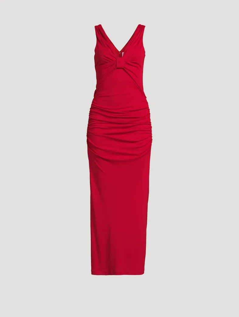 Crafted from a silky stretch jersey, this dress mixes comfort and elegance. It has a plunging neckline with a knotted detail at the bust and soft ruching at the hips.