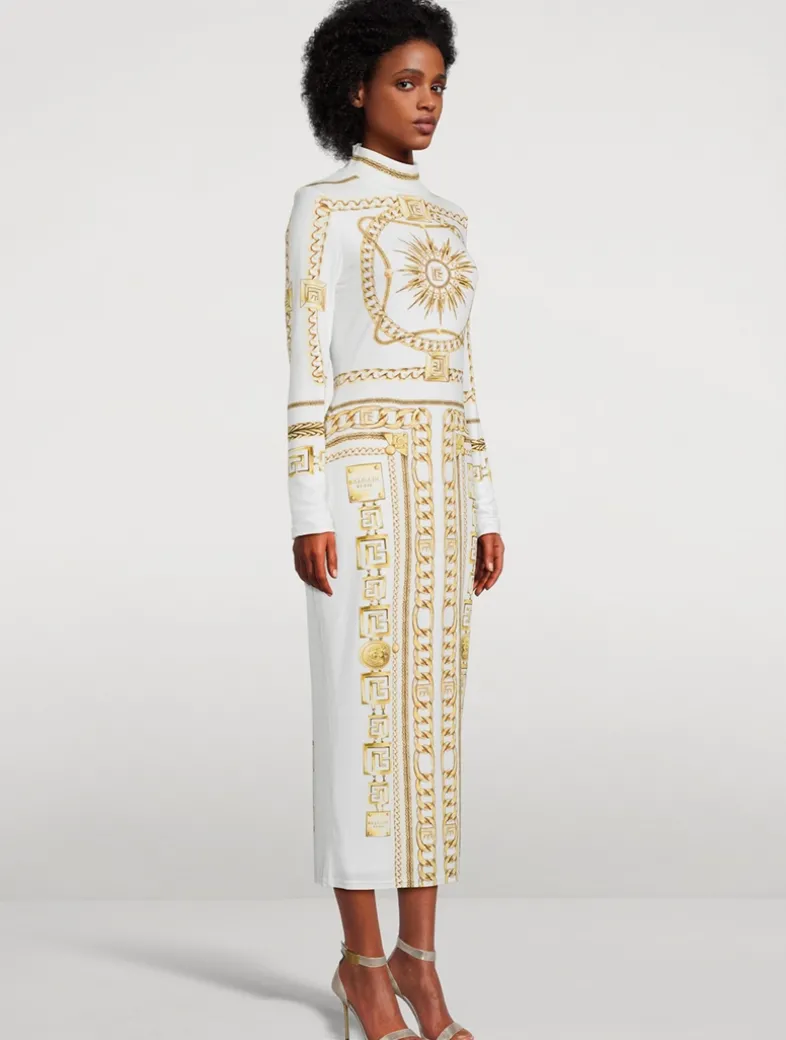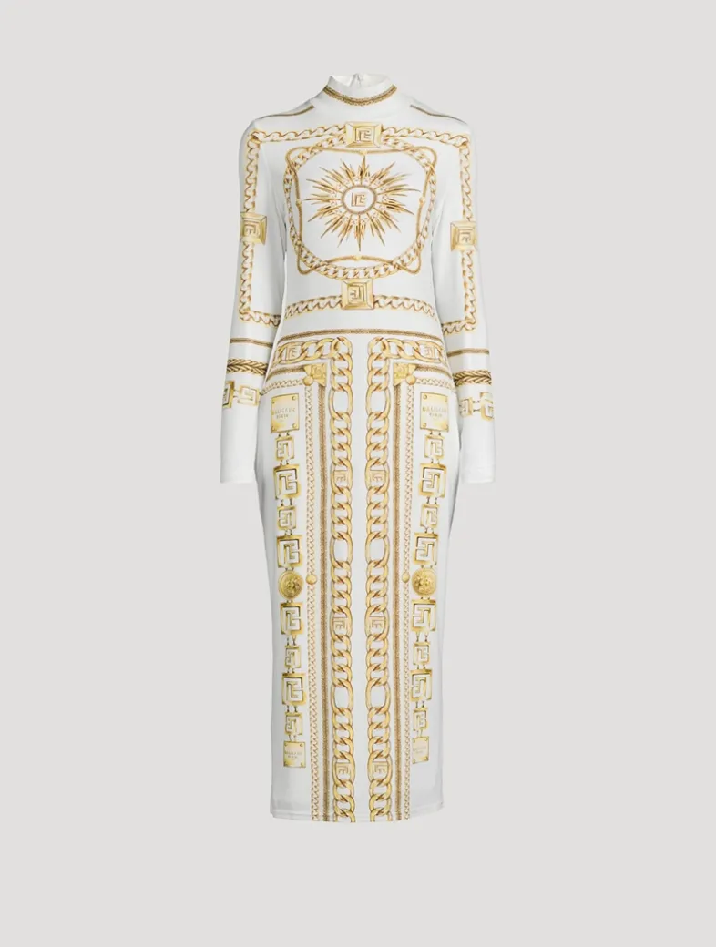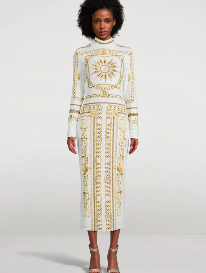 The sprawling Balmain Foulard pattern adorns this long-sleeve midi dress. Cut to a bodycon silhouette with a high neckline, it is crafted from stretch jersey and has a tone-on-tone lining.