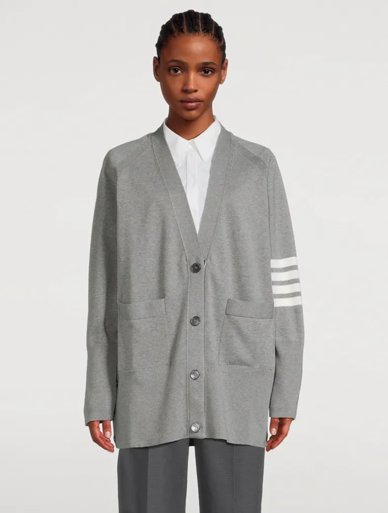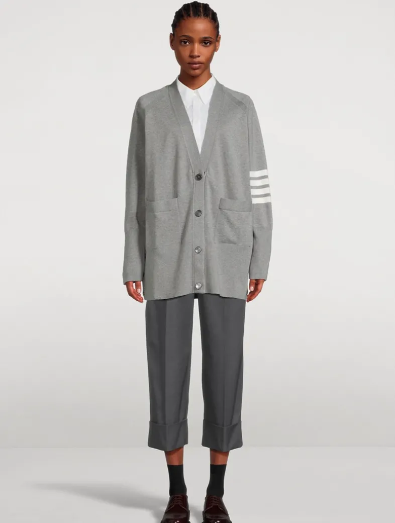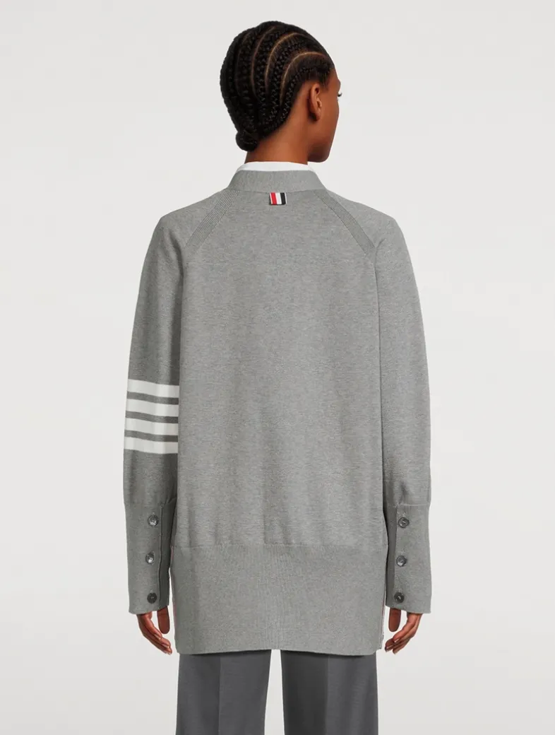 Made in Italy, this V-neck cardigan is designed with dropped shoulders and contrasting 4-bar stripe detail at the sleeve. Crafted in cotton, it is finished with a striped grosgrain placket, buttoned sides and cuffs with a striped trim, and signature striped grosgrain loop tab at the back neck.