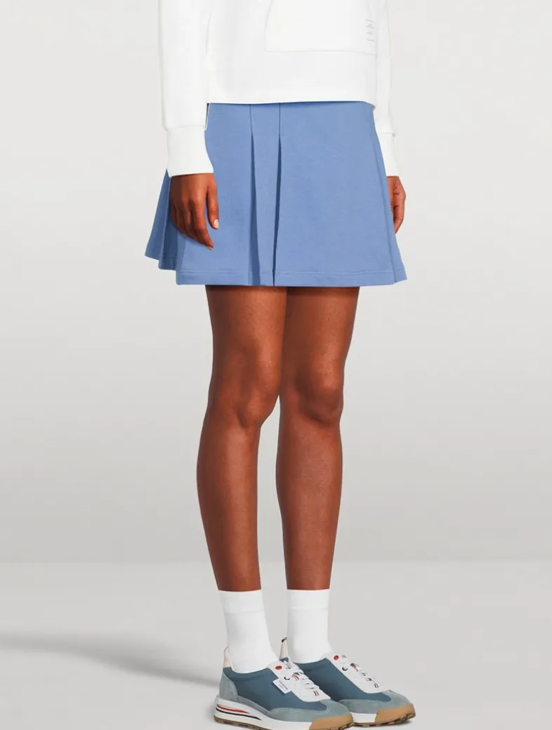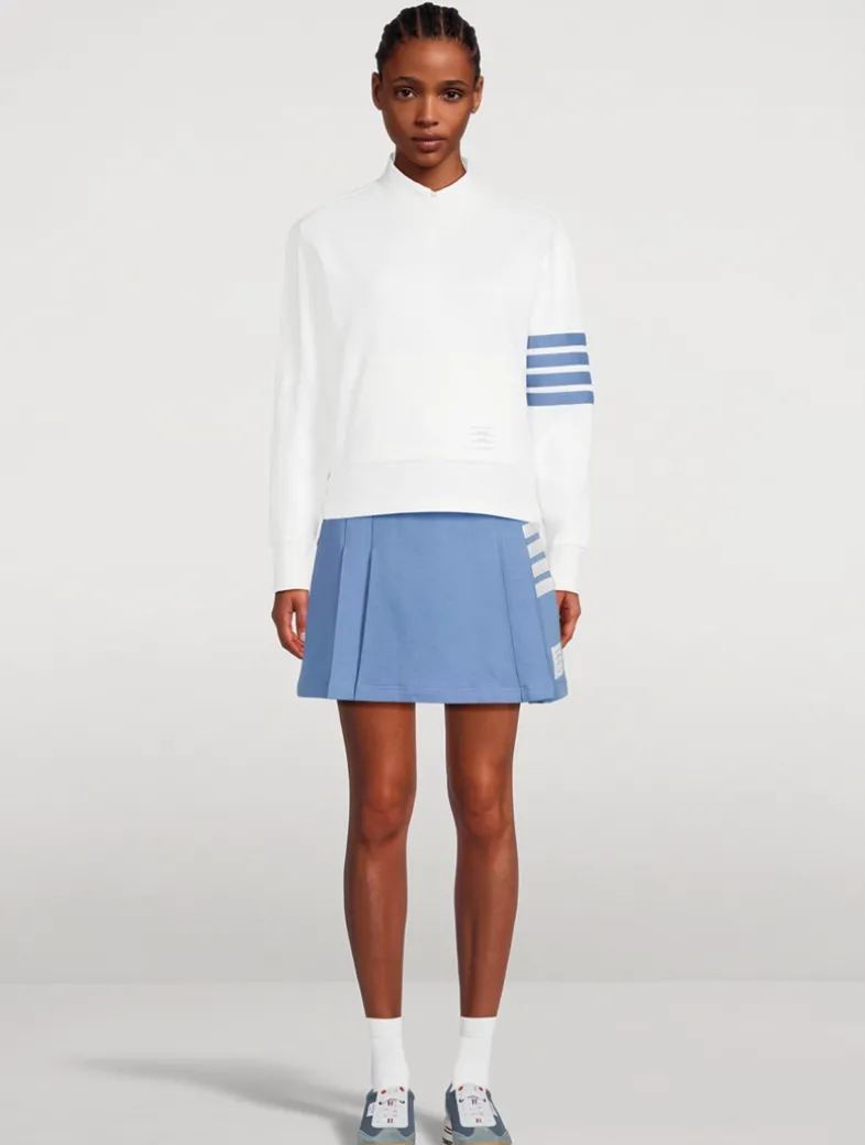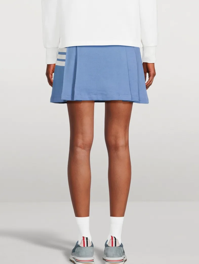 Offering an elevated take on a sporty style, this tennis skirt is crafted from cotton jersey printed with Thom Browne’s signature four-bar stripes. It has an elastic waistband and pleating at the sides, framing smooth front and back panels.