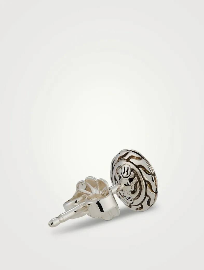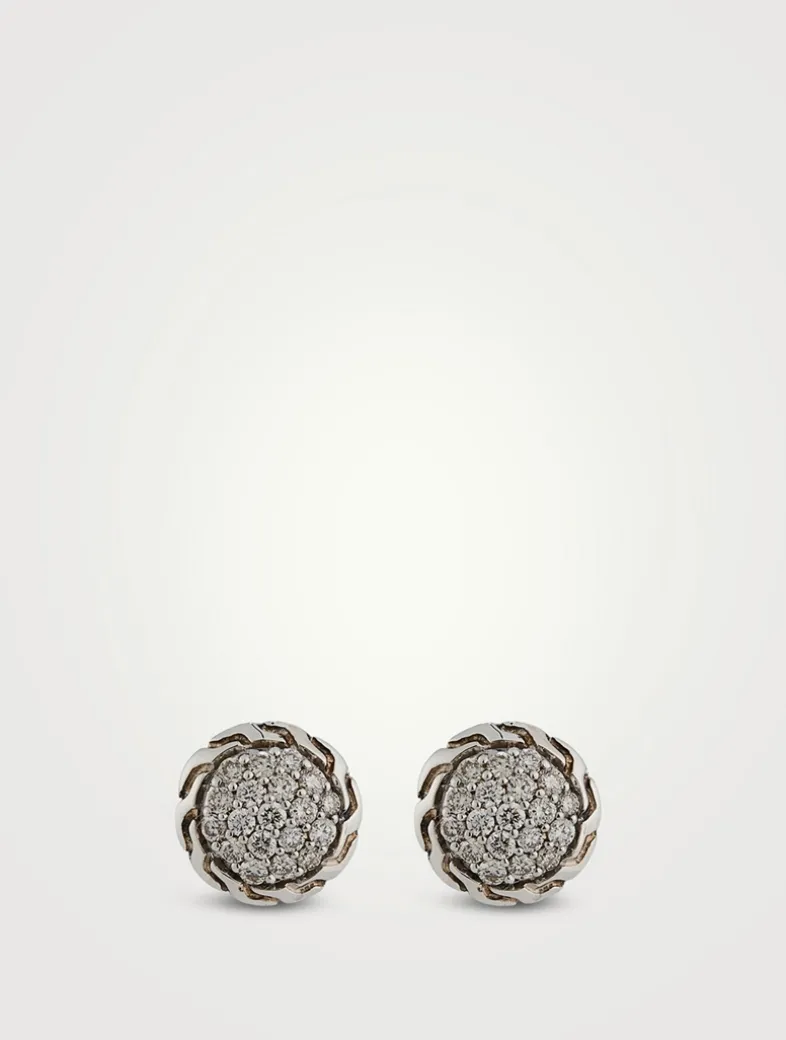 Artisan handcrafted, these stud earrings in 100% reclaimed sterling silver are inlaid with ethically sourced pavé diamonds encircled by the signature carved chain motif.