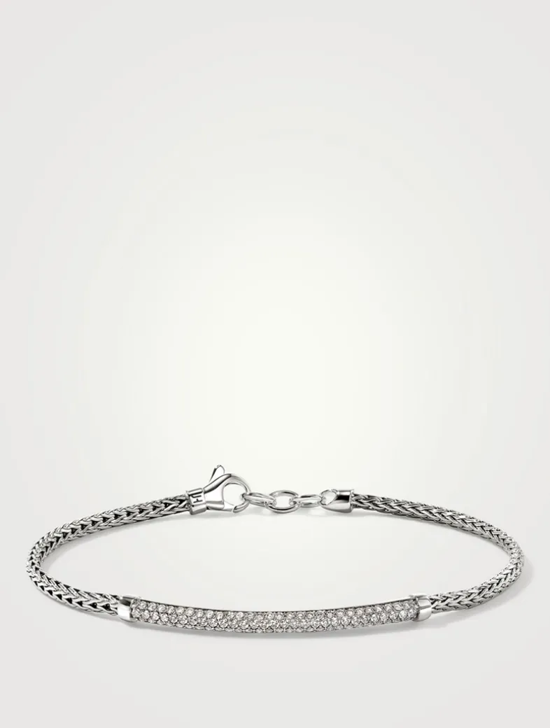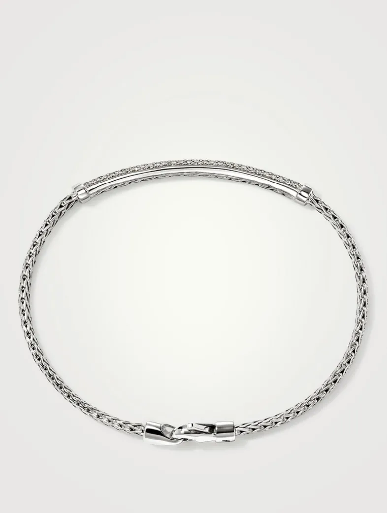 A delicate, artisan-handcrafted bracelet in sterling silver, featuring John Hardy’s signature woven chain and finely hand-set pavé diamonds.