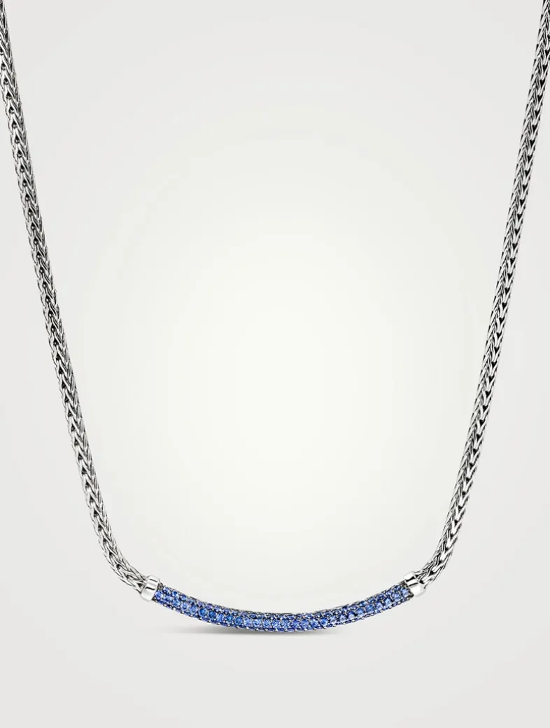 This delicate pavé necklace features John Hardy’s signature woven chain in reclaimed sterling silver and ethically sourced blue sapphires. Artisan handcrafted.
