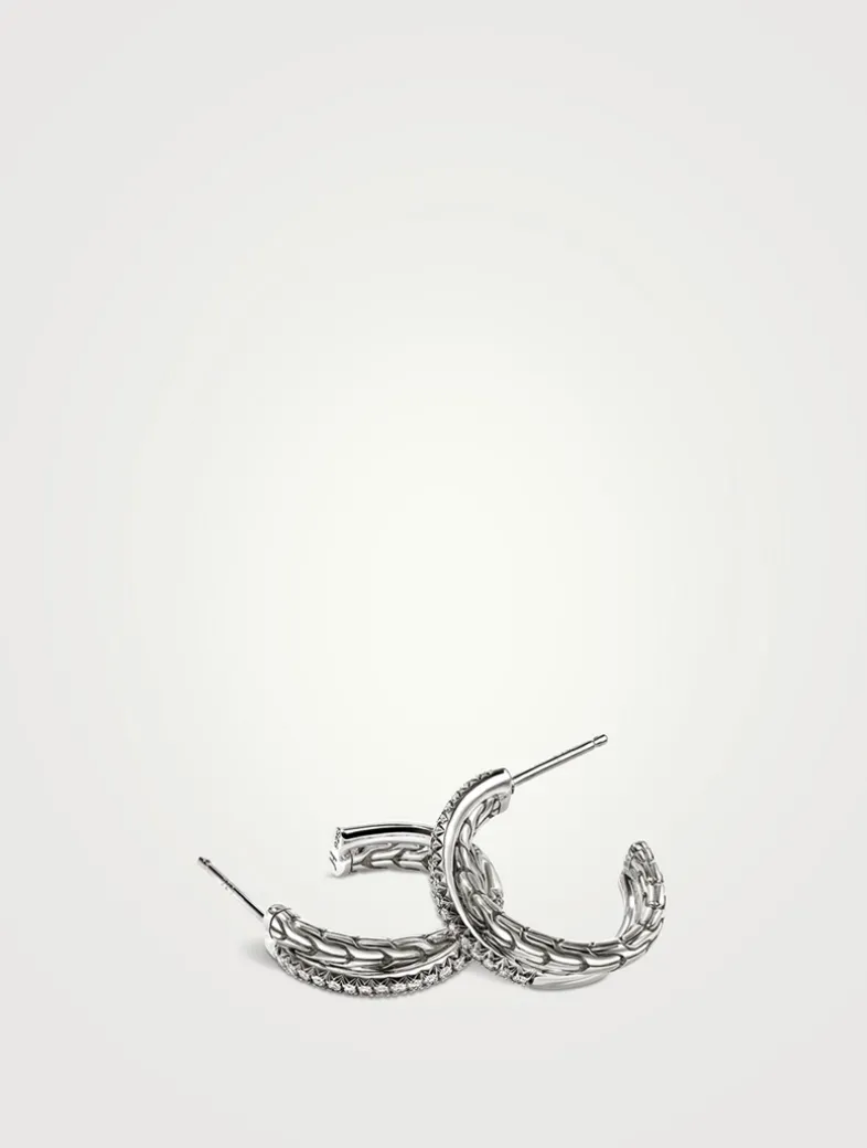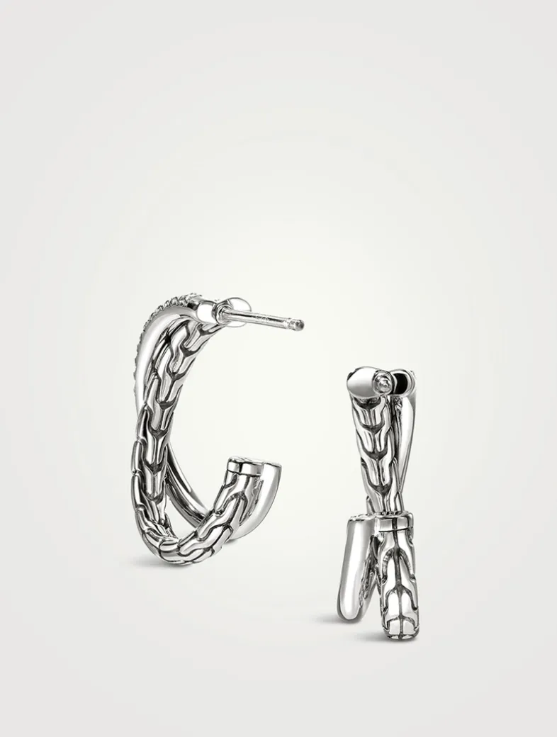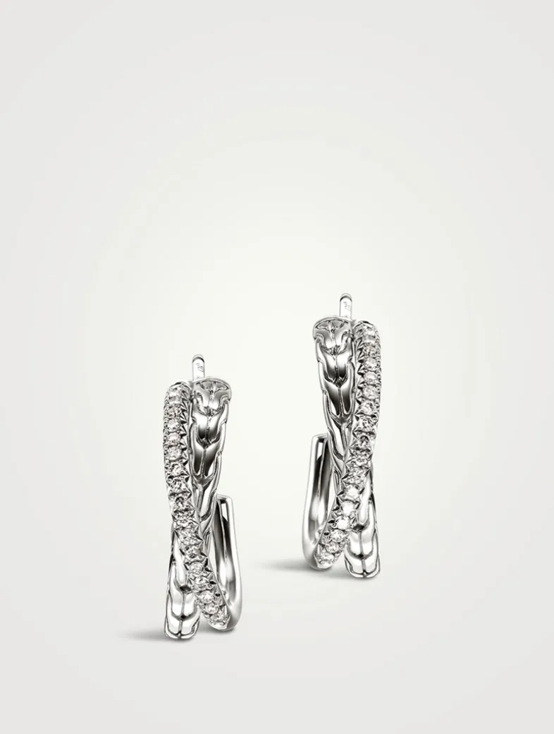 Artisan handcrafted, these sterling silver crossover earrings pair John Hardy’s signature carved chain motif with brilliant white diamond pavé.