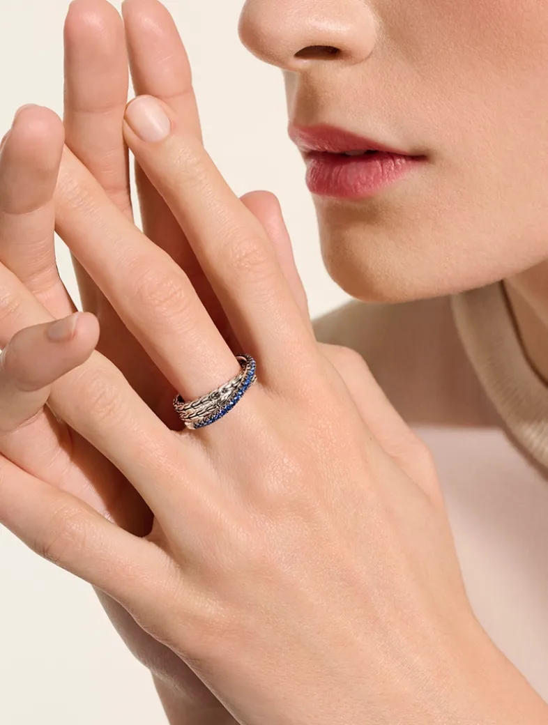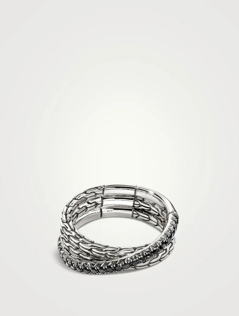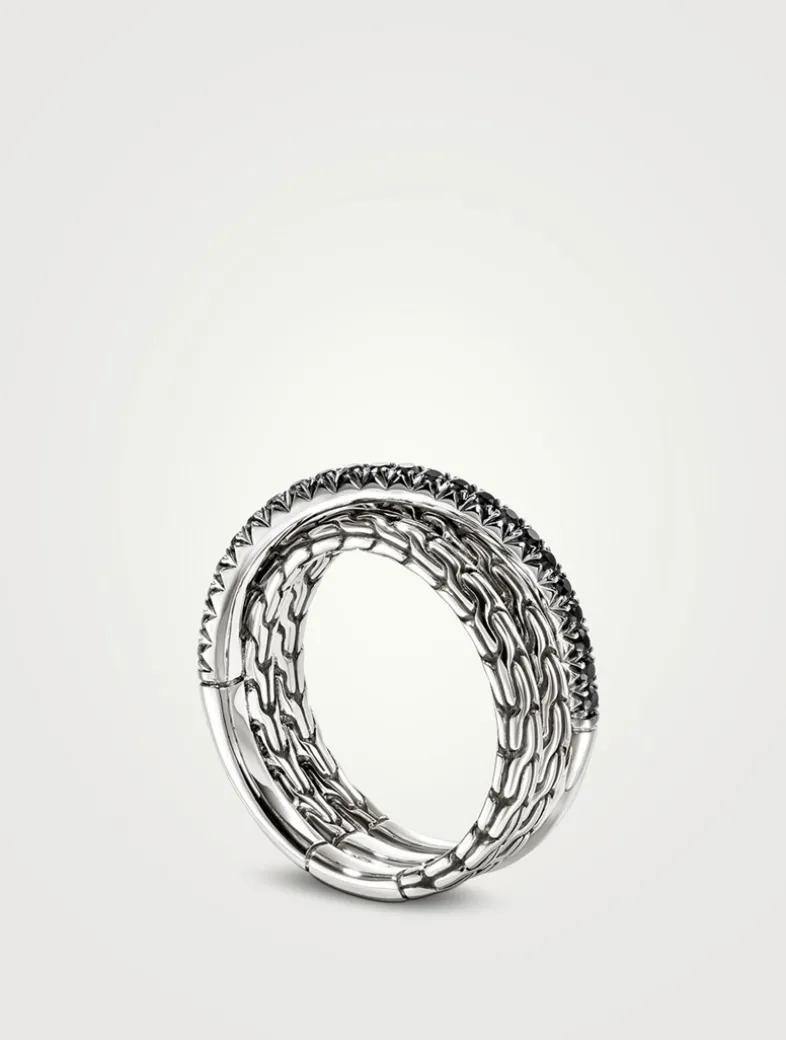 Artisan handcrafted, this crossover band ring in sterling silver features John Hardy’s signature carved chain motif and black sapphire pavé.