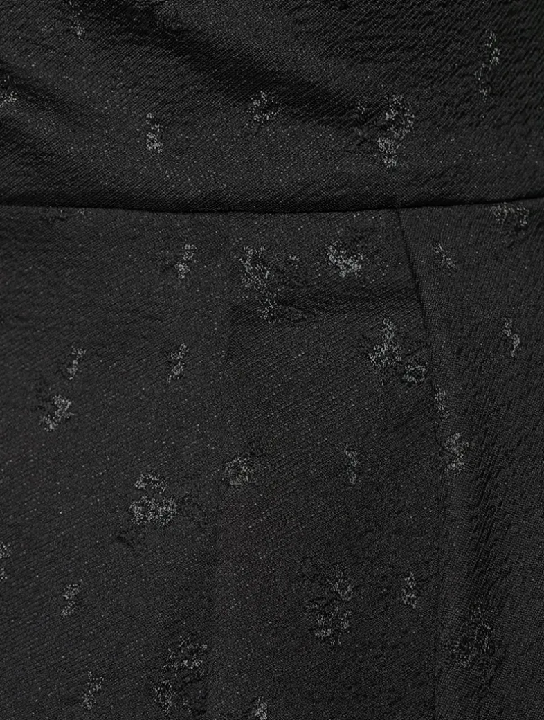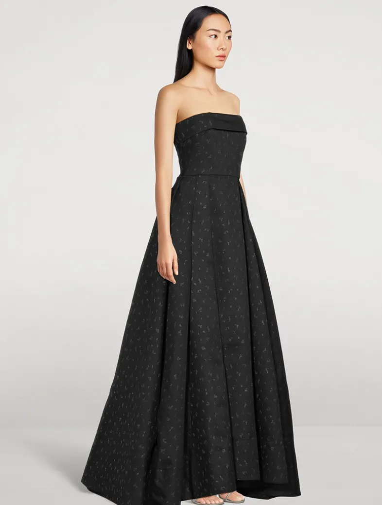 A timeless evening style, this sweeping jacquard gown is designed with a fully-boned strapless corset and high-low silhouette featuring pockets on the sides.