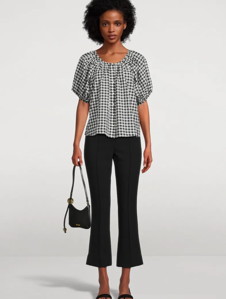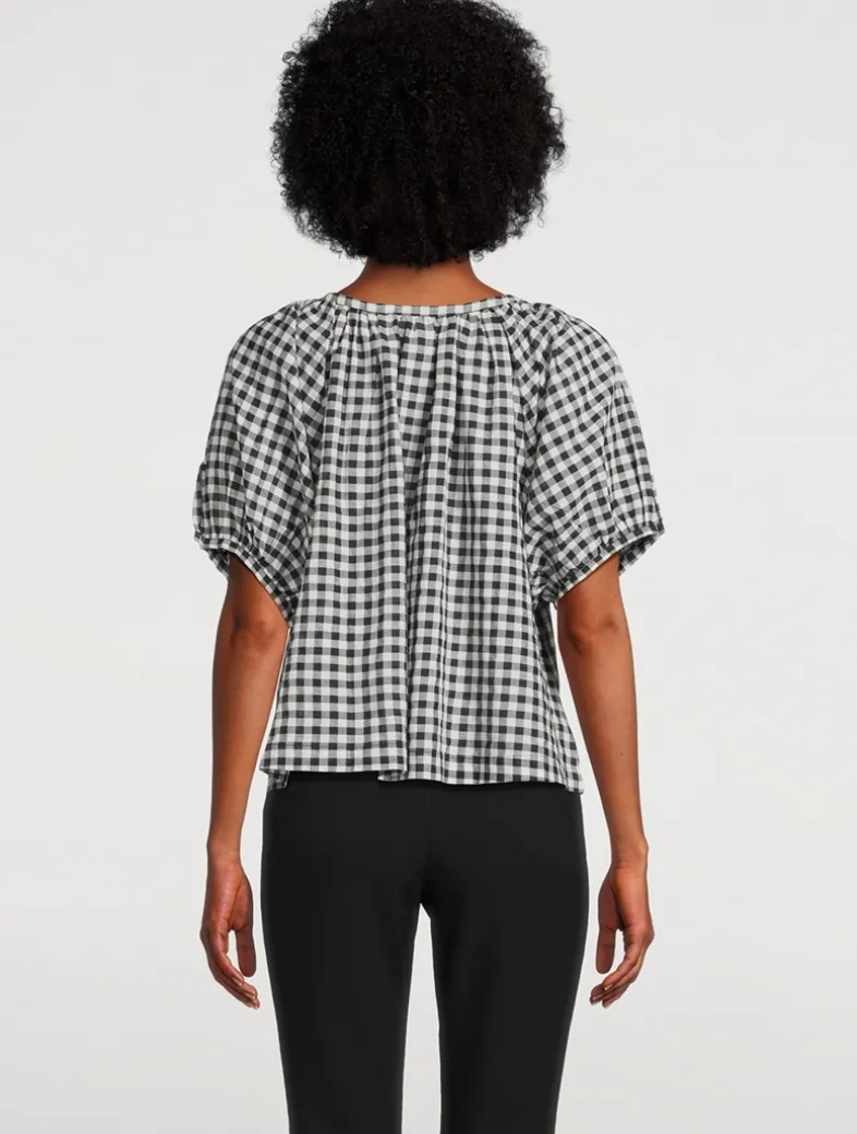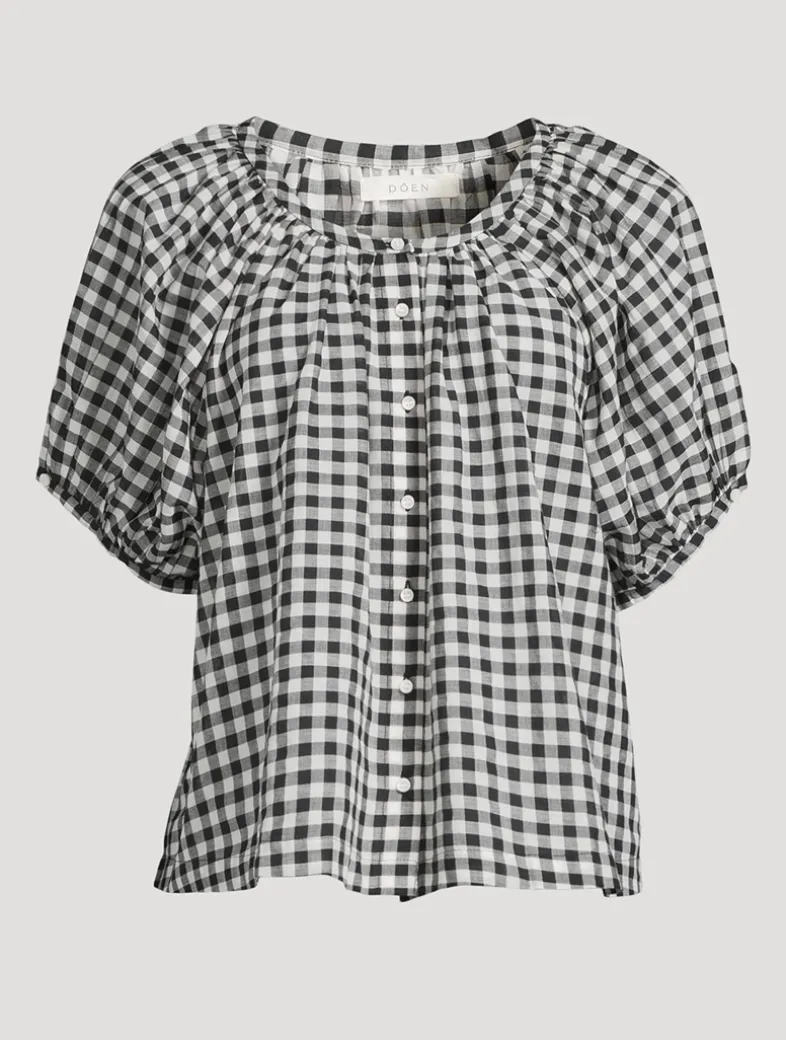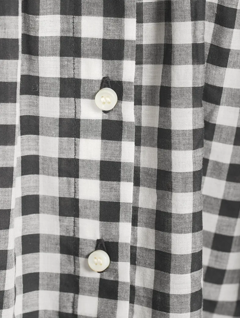 Crafted from a lightweight organic cotton voile, the June is a short-sleeved blouse. In a ‘50s-inspired gingham print, it features a gathered scoop neckline, full raglan sleeves, and a relaxed, breezy cut. A line of mother-of-pearl buttons extends down the center front. Certified to the Global Organic Textiles Standard (GOTS).