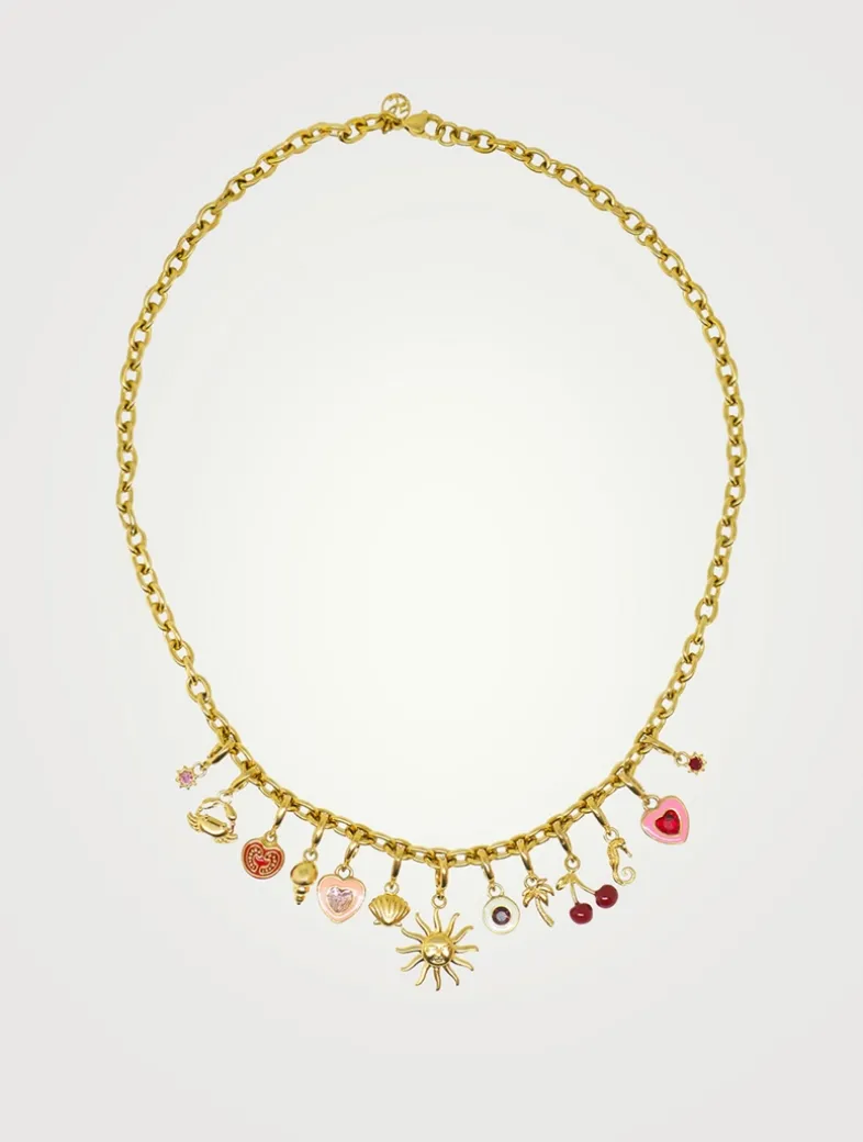 Featuring a sun pendant, sea-inspired motifs and playful pinks, each charm on this necklace tells a story of adventure, passion, and positivity. Perfect for layering or wearing solo. Each charm is equipped with a special clasp that allows you to easily remove and arrange them on the chain for a custom look. Free of lead, nickel and cadmium.