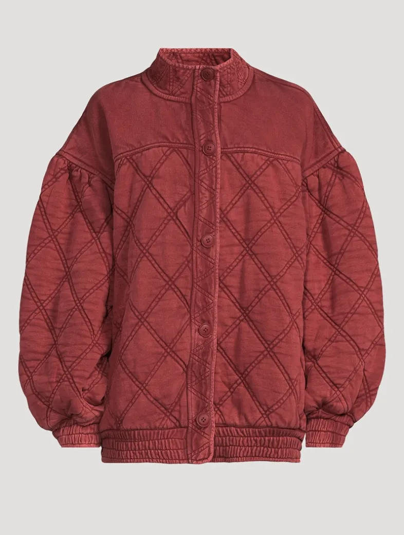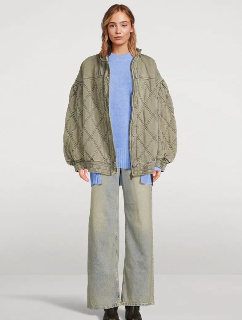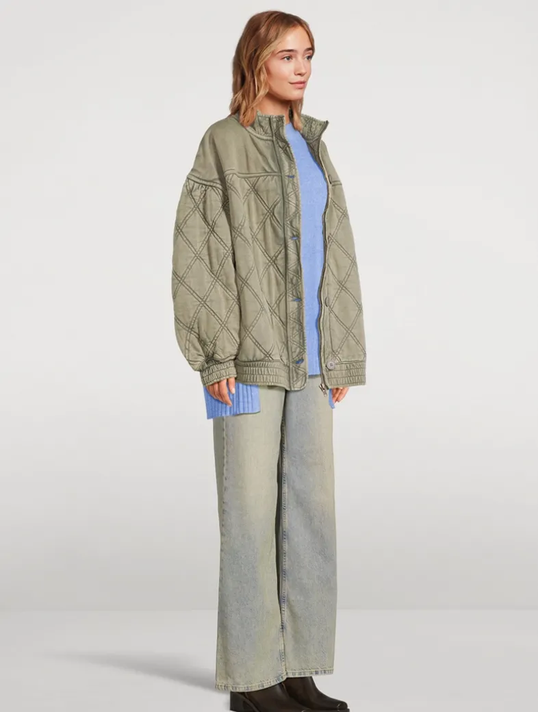 Effortless and oversized, this too-cool bomber jacket features extra wide sleeves with quilting throughout and shirred trim. Featuring a comfy cotton fabrication, dropped shoulders, and a zipper closure with button placket.