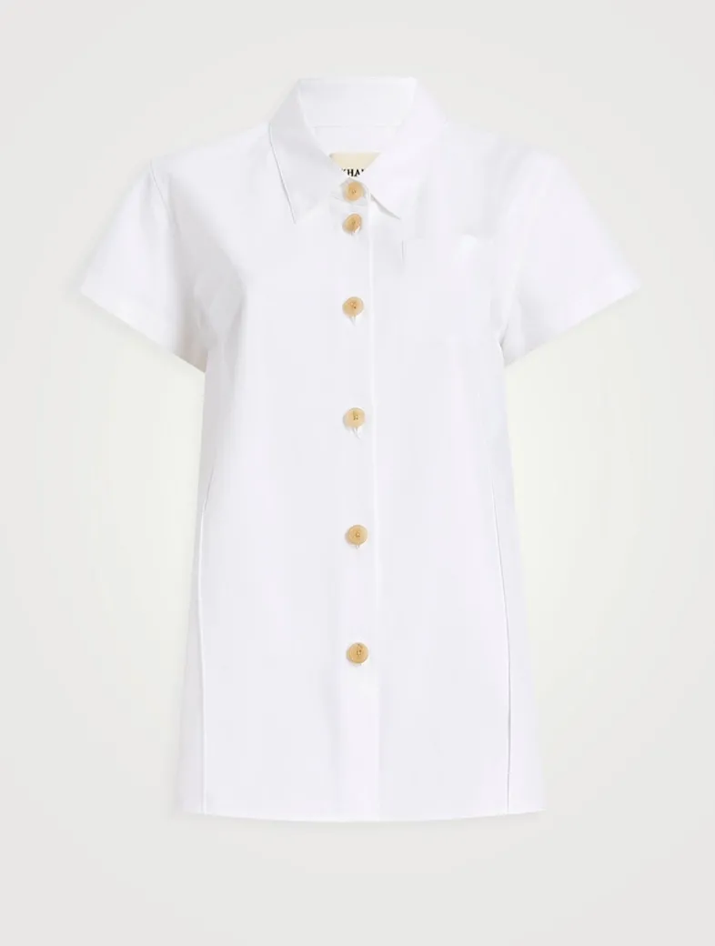 A short-sleeved button-up in crisp cotton poplin refined by pintucks at front and back. It is designed with a back yoke, welt pocket at the chest, and gently arched hem.