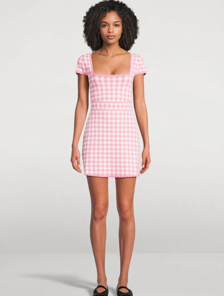 Cut to a curve-hugging silhouette with cap sleeves and a square neckline, this mini dress is printed with a classic gingham motif finished with delicate scallop lace trim.