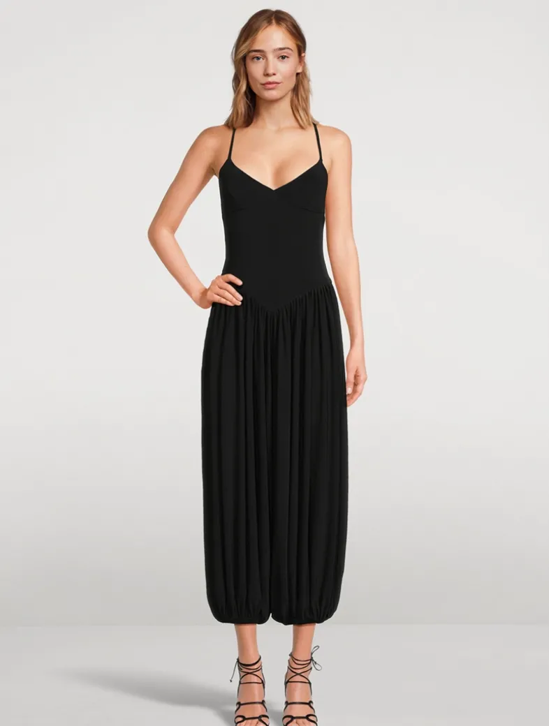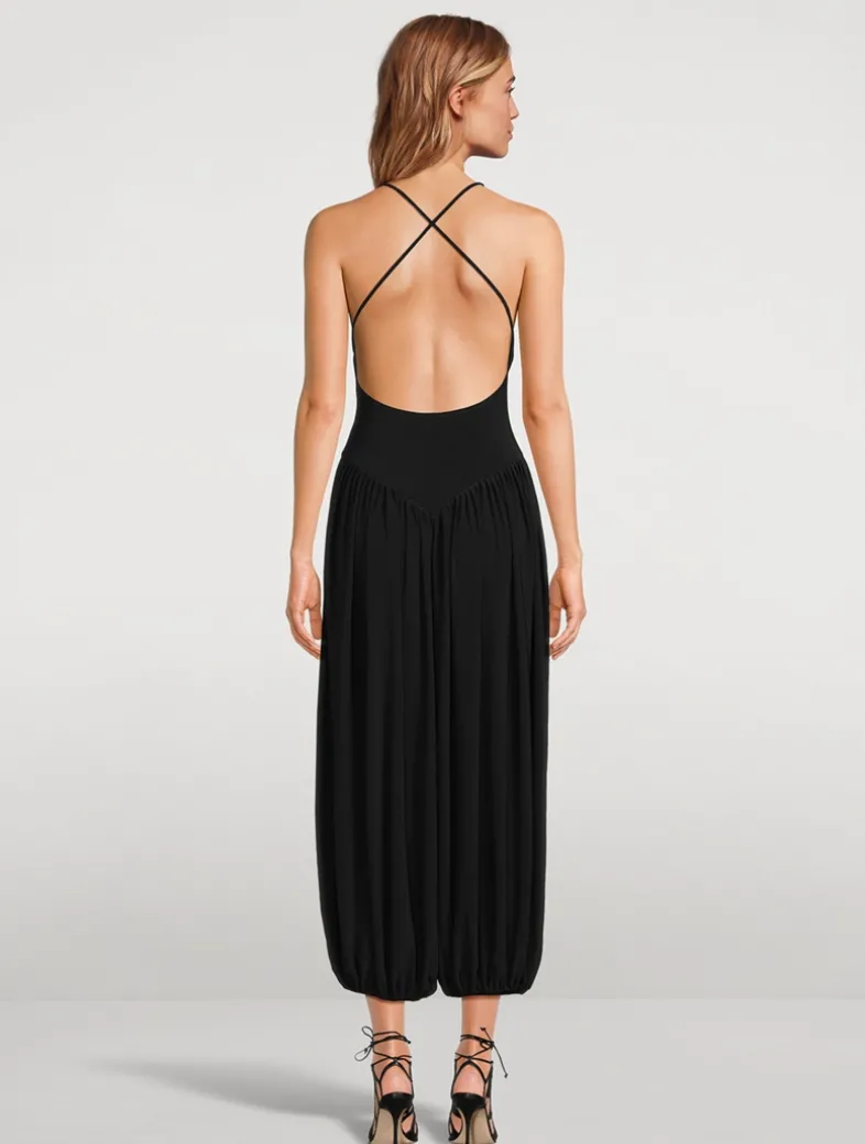 Crafted from soft jersey, this jumpsuit can be dressed up or down. It has a fitted bodice with a V-neckline and slim straps that cross at the back. Its cropped trousers are gathered at the hips and fall to a blouson shape with gathered cuffs.