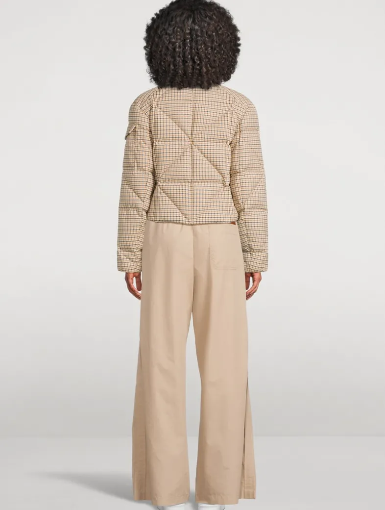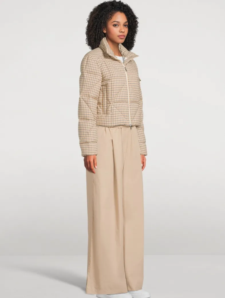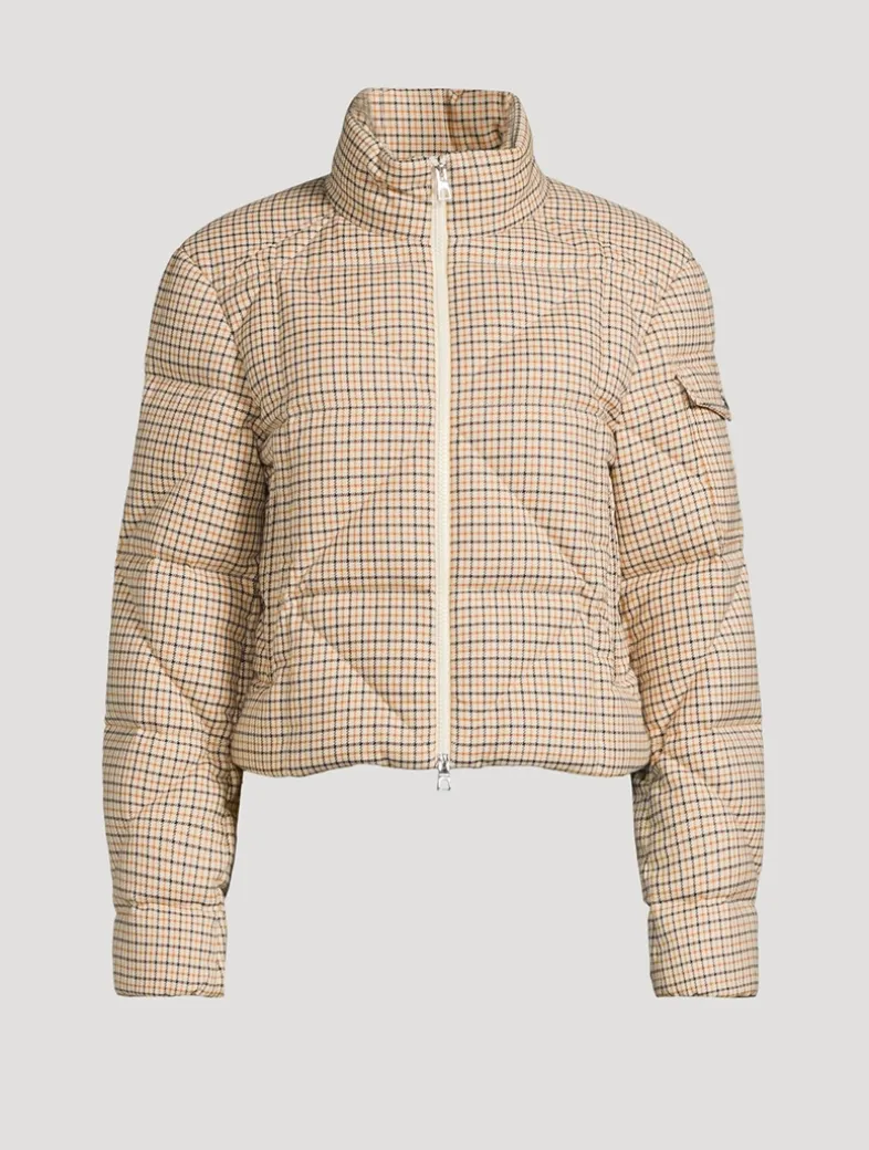 This cropped puffer jacket is filled with down for added warmth and quilted for a classic sporty look. It has a bold plaid print and zipped pockets at the waist.