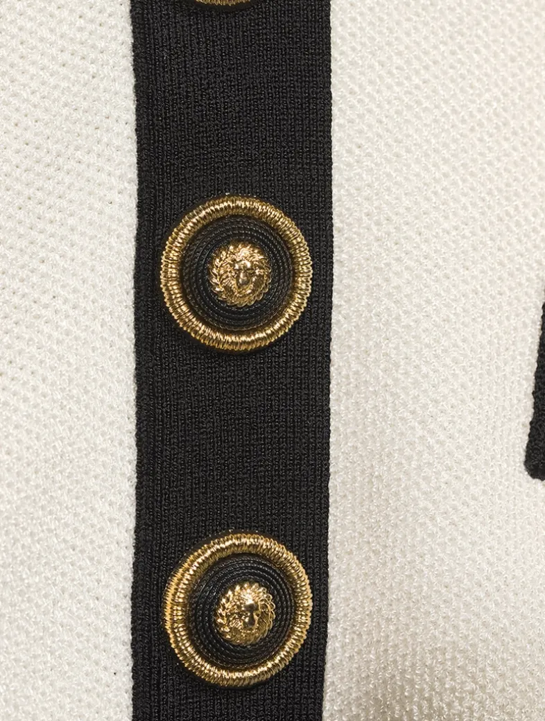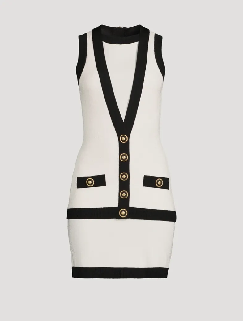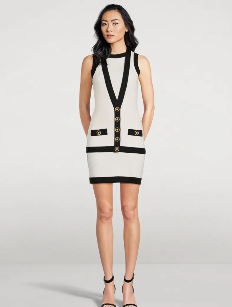 This sleeveless mini dress has a faux layered design with an integrated V-neck waistcoat and contrasting ribbed edging. It is embellished with
