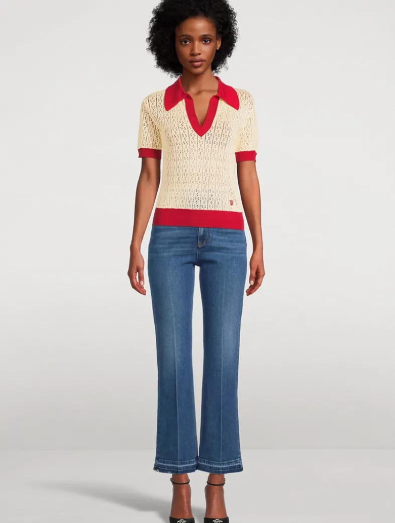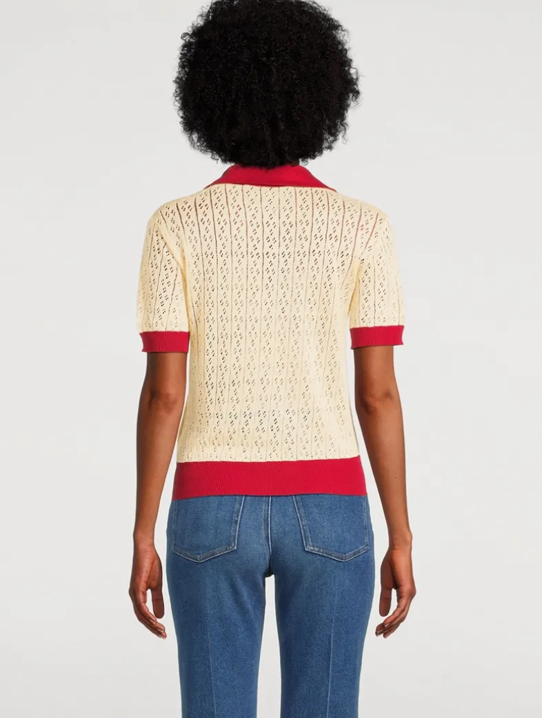 Knit from a linen blend with a pointelle finish, this short-sleeve polo nods to vintage-inspired styles. It is edged with contrasting trim and finished with an embroidered logo at the hip.