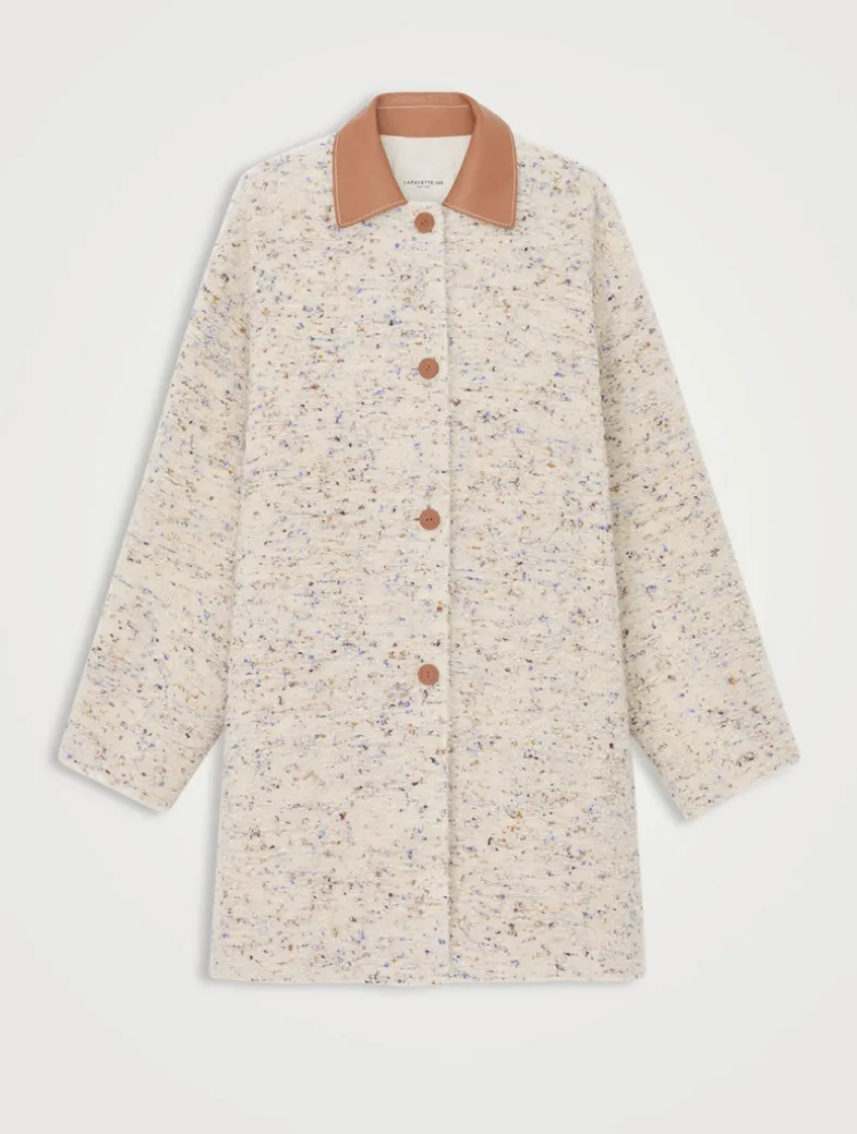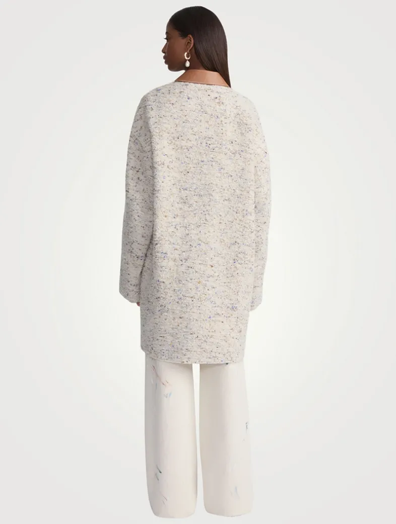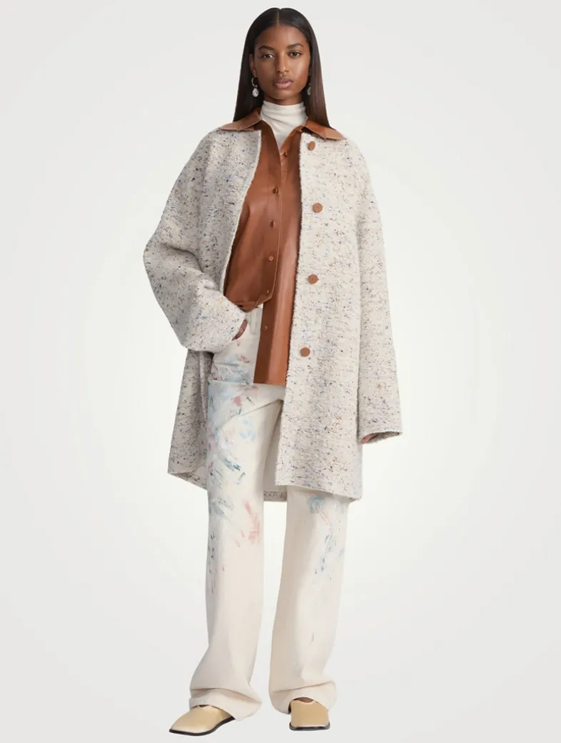 This long car coat is constructed in a specialized knotted bouclé fabric with luxuriously rich, dimensional texture and playful pops of colour, nodding to the painter’s palette that’s celebrated throughout the collection. The cocooning straight shape is cut at the knee and defined by raw-edge seaming, with contrasting smooth leather at the collar and buttons.