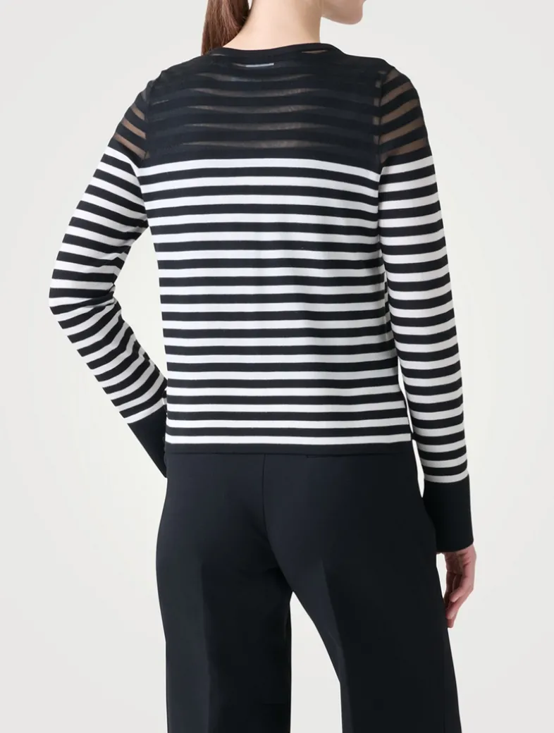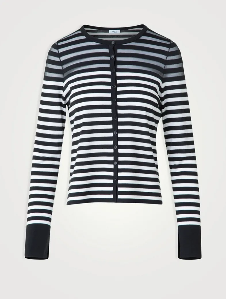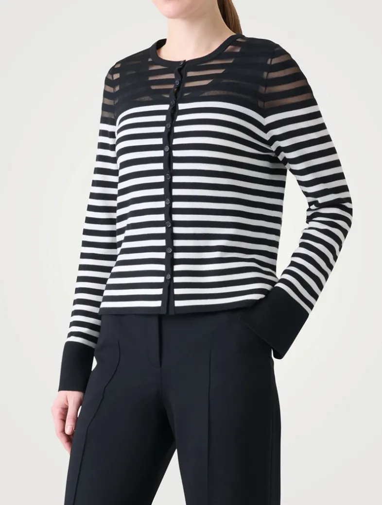 Crafted from a merino wool blend with a hint of stretch, this button-down sweater features kodak stripes and semi-sheer detailing at the shoulders and back.