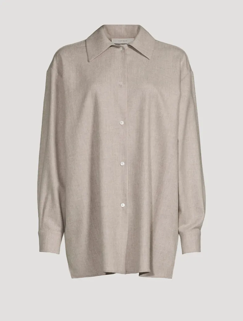 Made from soft brushed wool cashmere flannel, this relaxed button-up has a boxy fit, exposed front placket, and classic hem finish.