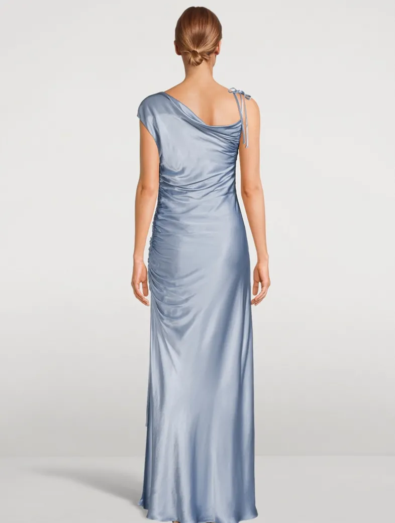 Flaunting an asymmetric design, this one-shoulder dress has a draped neckline with tied straps at the shoulder. It is finished with soft ruching at the side. Crafted in a LENZING™ ECOVERO™ blend with luxurious sheen.