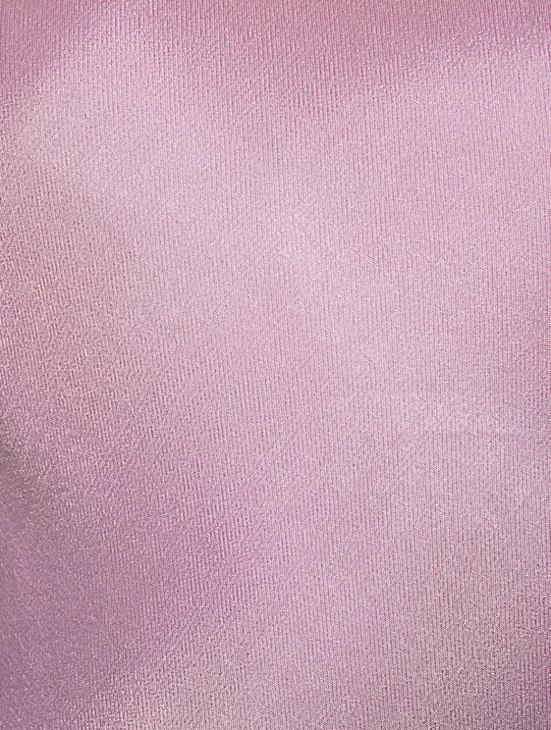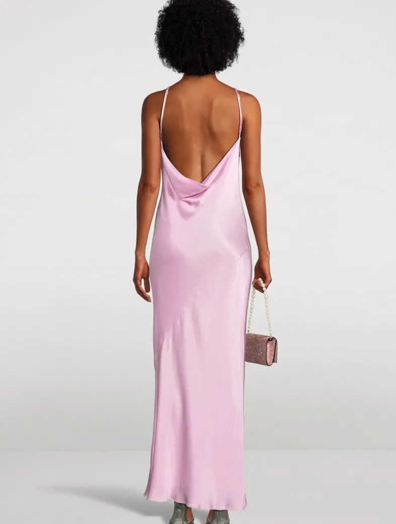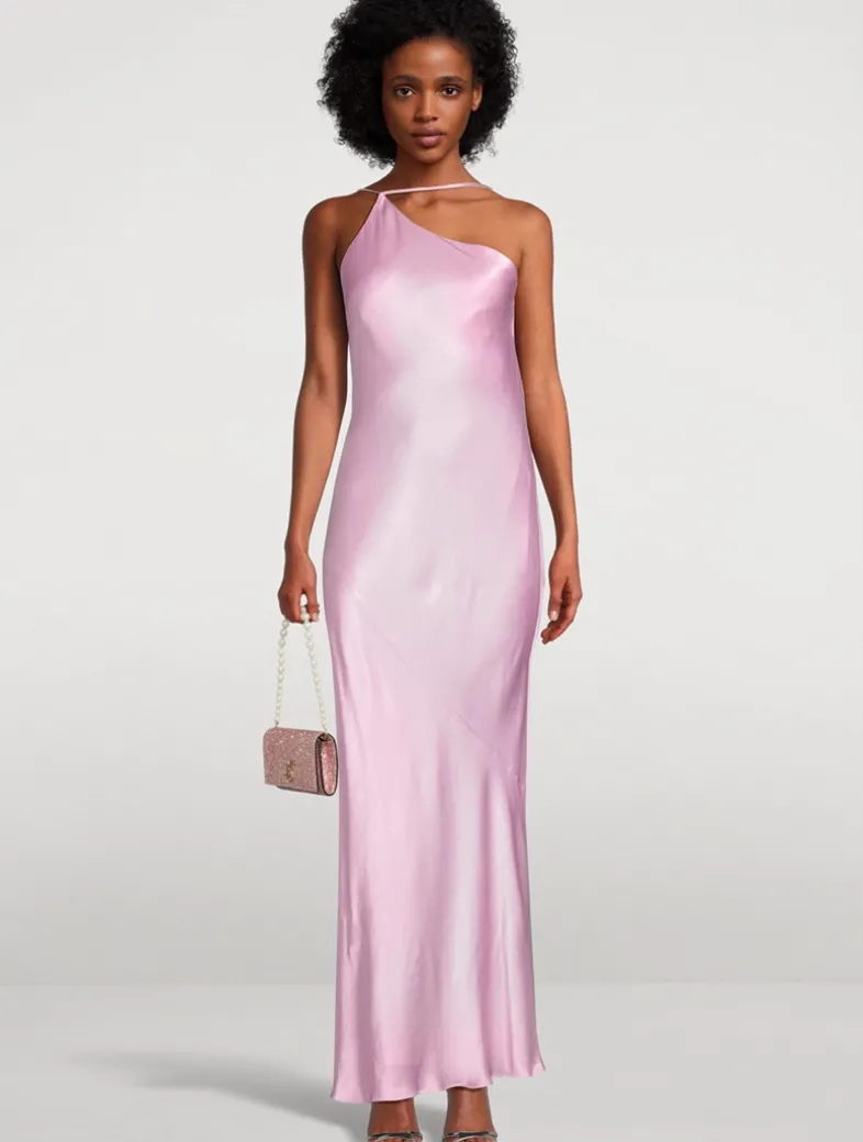 This elegant bias-cut dress has an asymmetrical design in LENZING™ ECOVERO™ with luxurious satin finish. It has a one-shoulder neckline framed by adjustable straps and an open back with draped cowl detail.