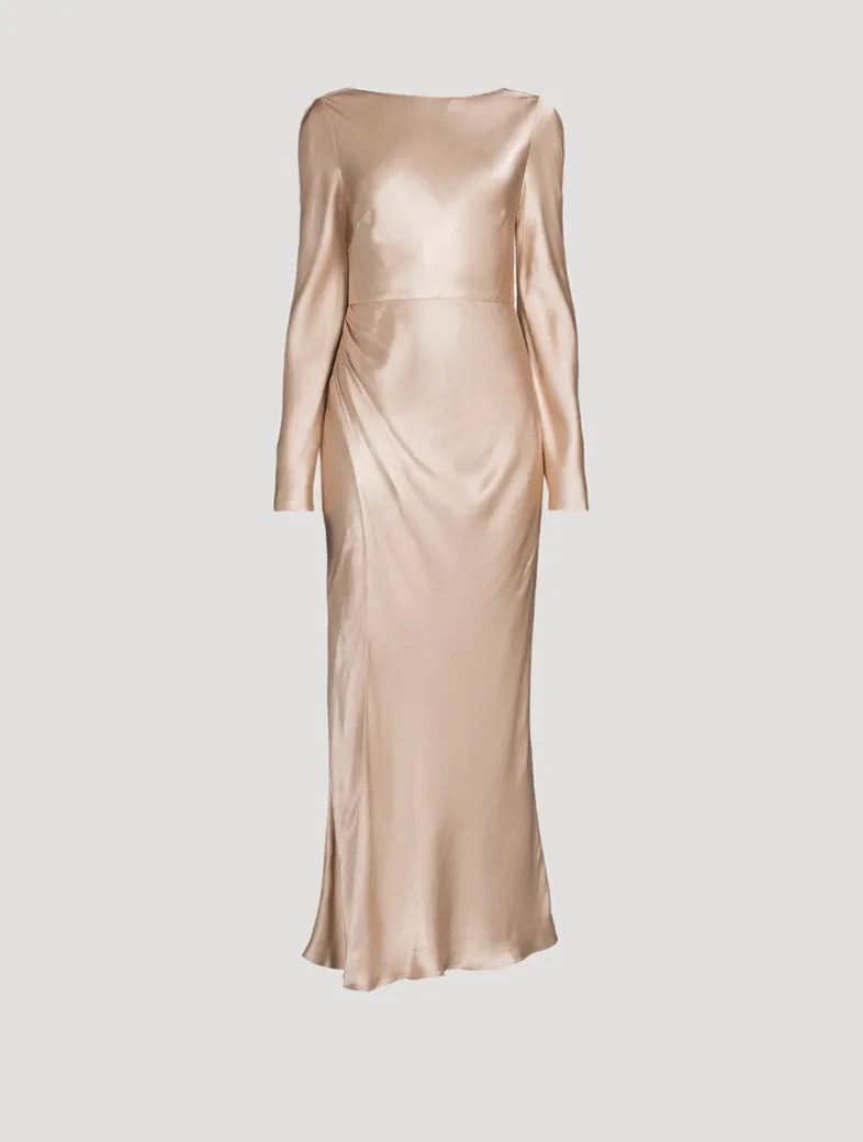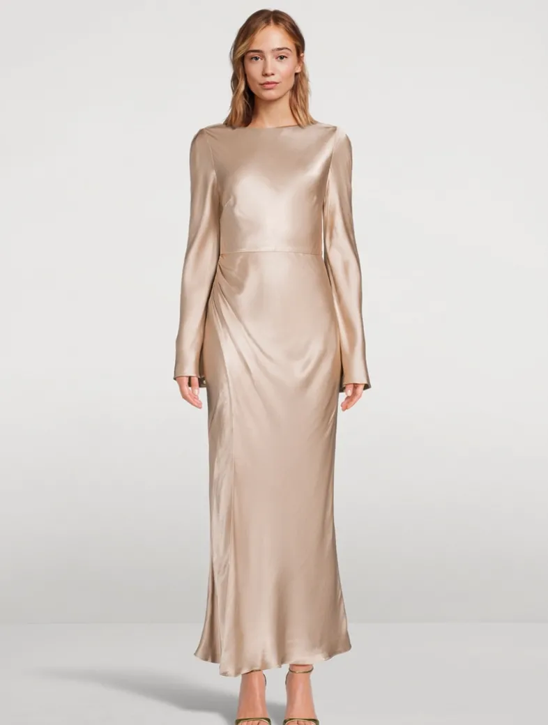 Framed by long bell sleeves, this satin dress is finished with a plunging back detail and an ankle-grazing, bias-cut skirt with side slit. Crafted in a LENZING™ ECOVERO™ blend with luxurious sheen.