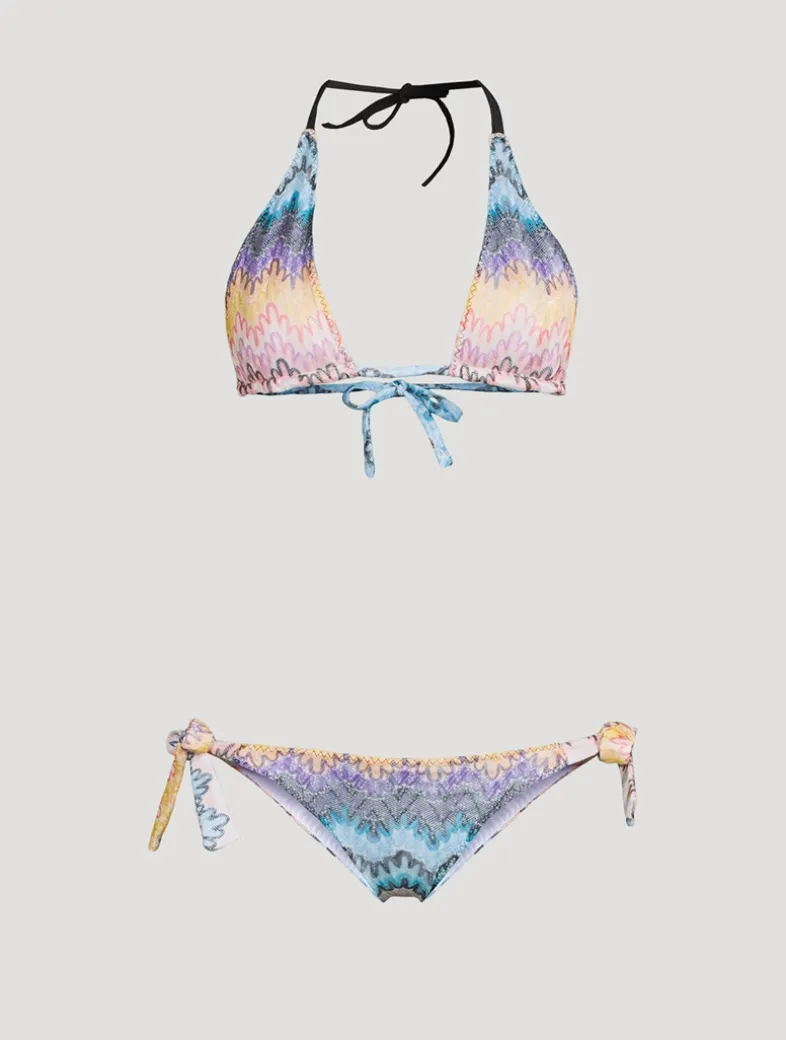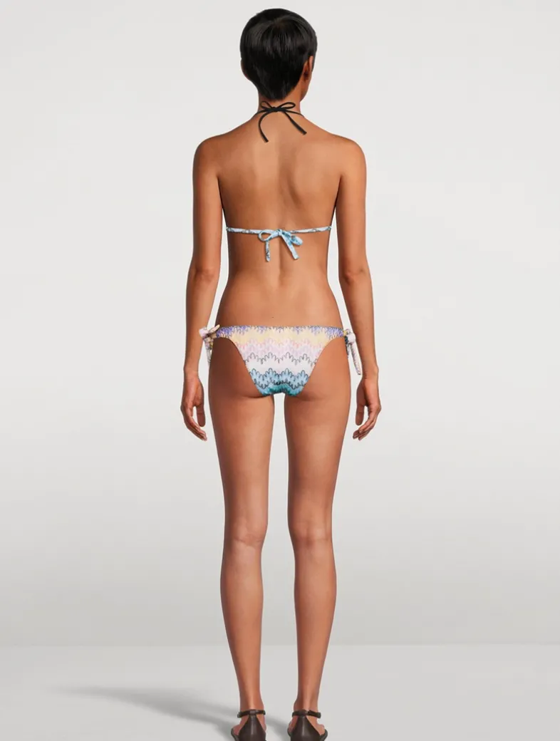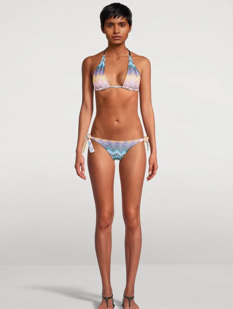 This bikini consists of a triangle bra and low-waisted briefs, with the knit fabric shaded with lurex threads lending an unmistakable glow. Versatility and bold femininity come together harmoniously in this summer must-have. Certified to OEKO-TEX® Standard 100, LEATHER STANDARD, or OEKO-TEX® MADE IN GREEN.