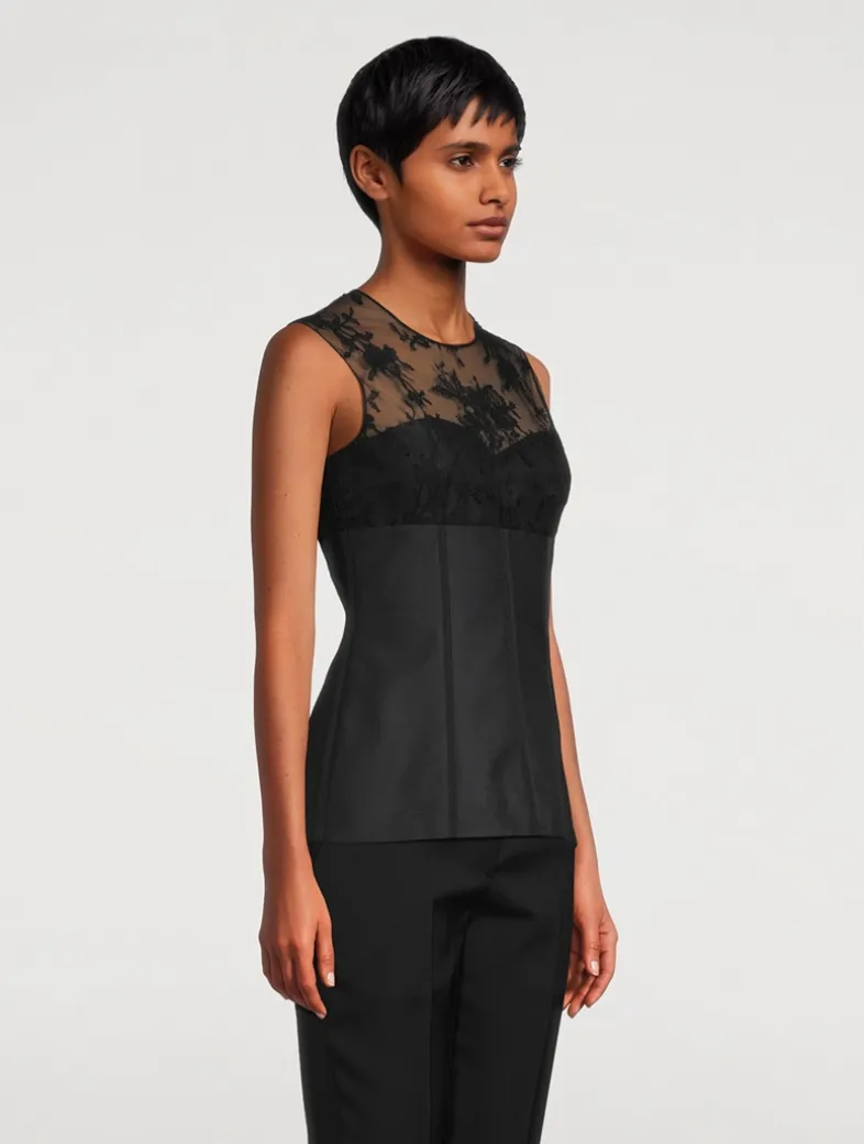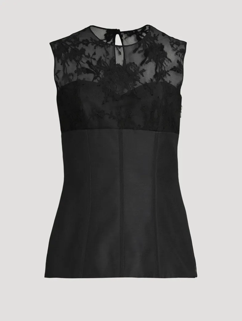 Nodding to lingerie-inspired styles, this sweetheart bustier is crafted from cotton silk faille adorned with a delicate floral tulle panel at the top. It is cut to flare gently over the hips and features a round neckline with keyhole and button at the back.