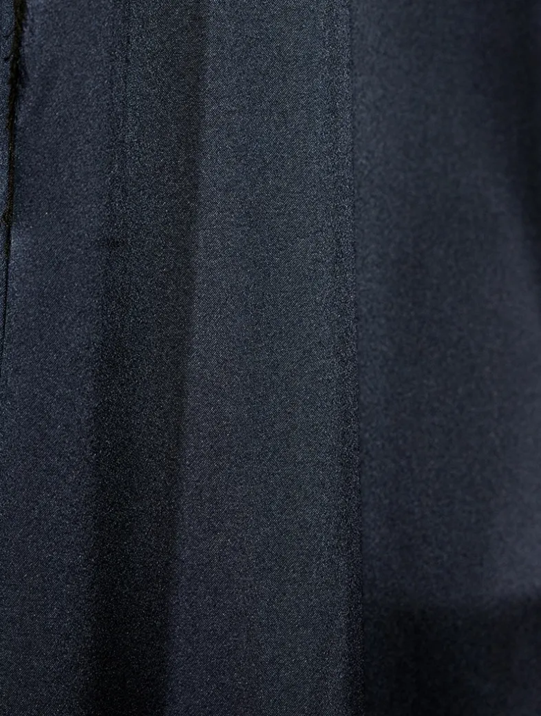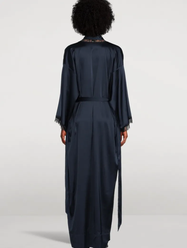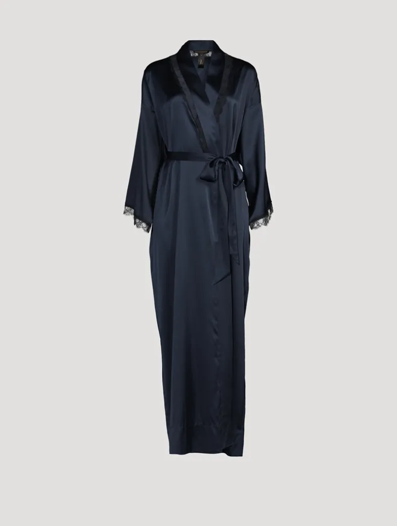 Crafted from the finest silk charmeuse, this floor-length robe drapes luxuriously, with delicate black lace trim accenting the sleeves.