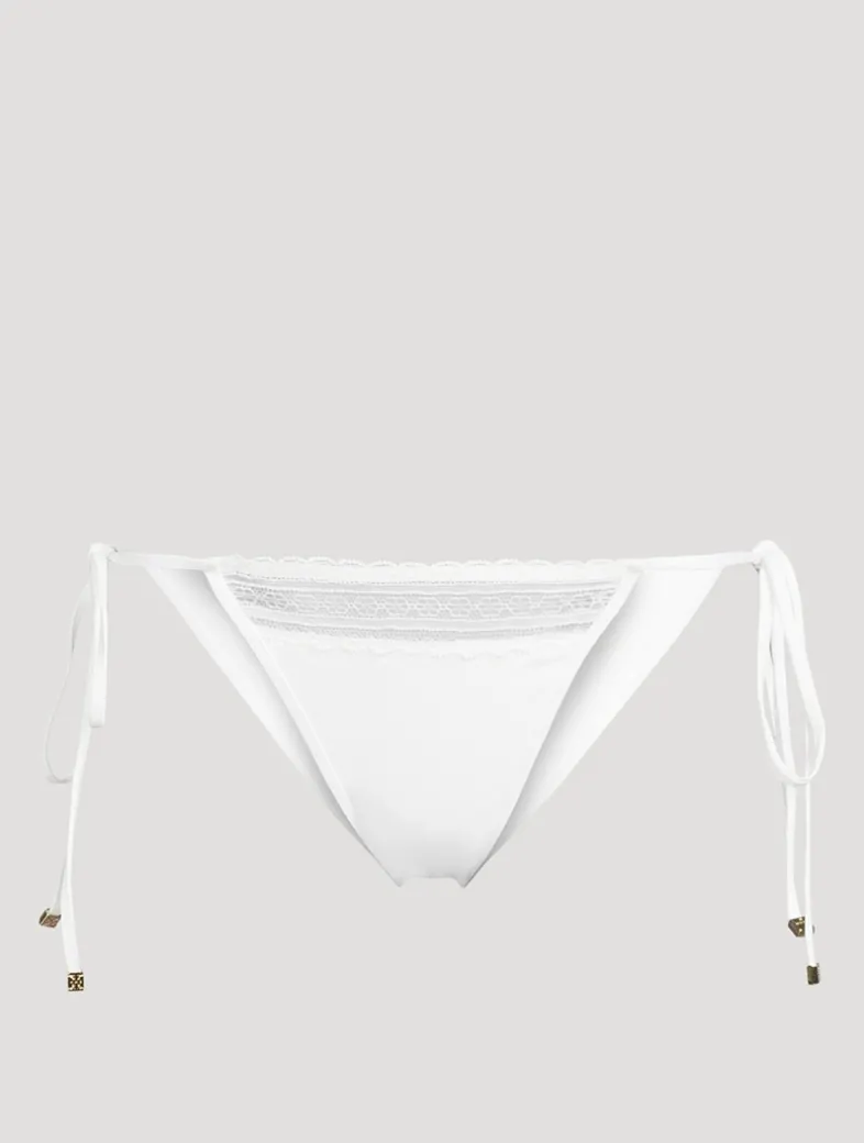 A delicate lace inset is placed into the perfect string bikini tie bottom. Made from Italian swim jersey with stretch French lace trim, these bottoms offer a flattering fit with adjustable ties featuring custom gold-tone KIKIDM stoppers and our signature gold Kiki butterfly at the back.