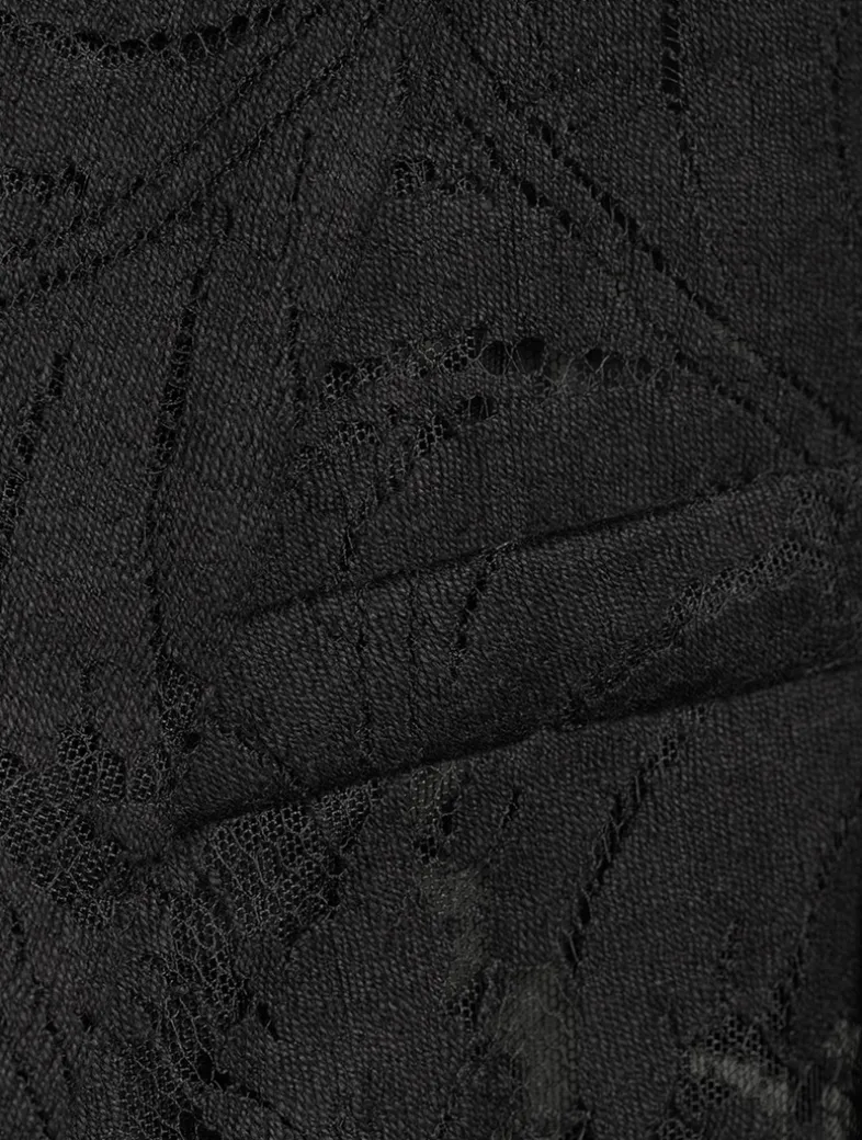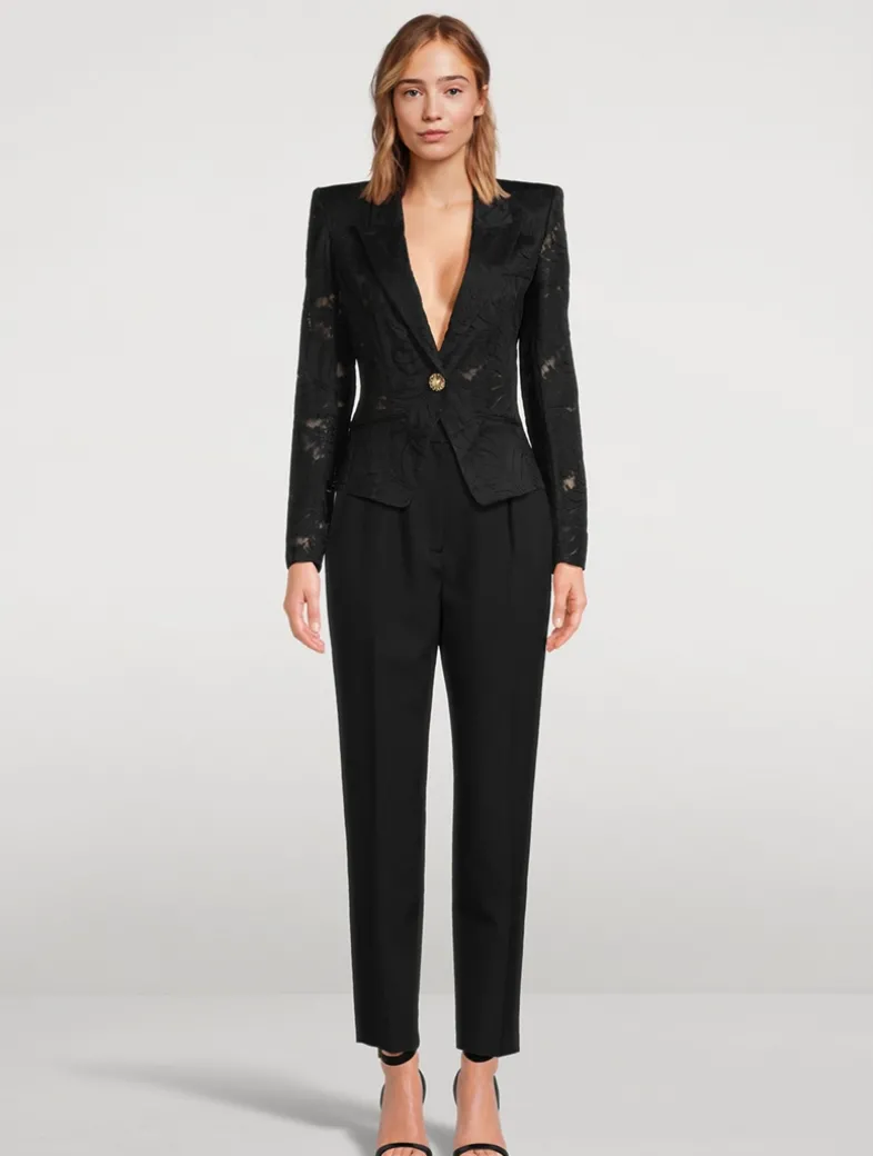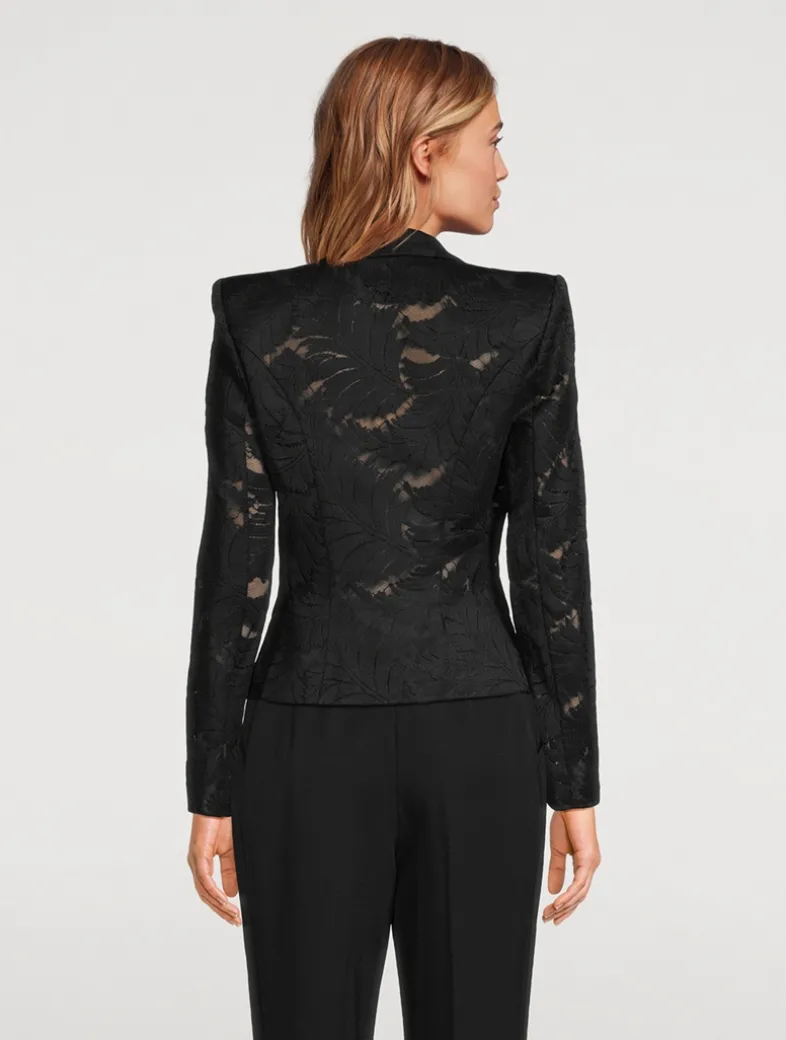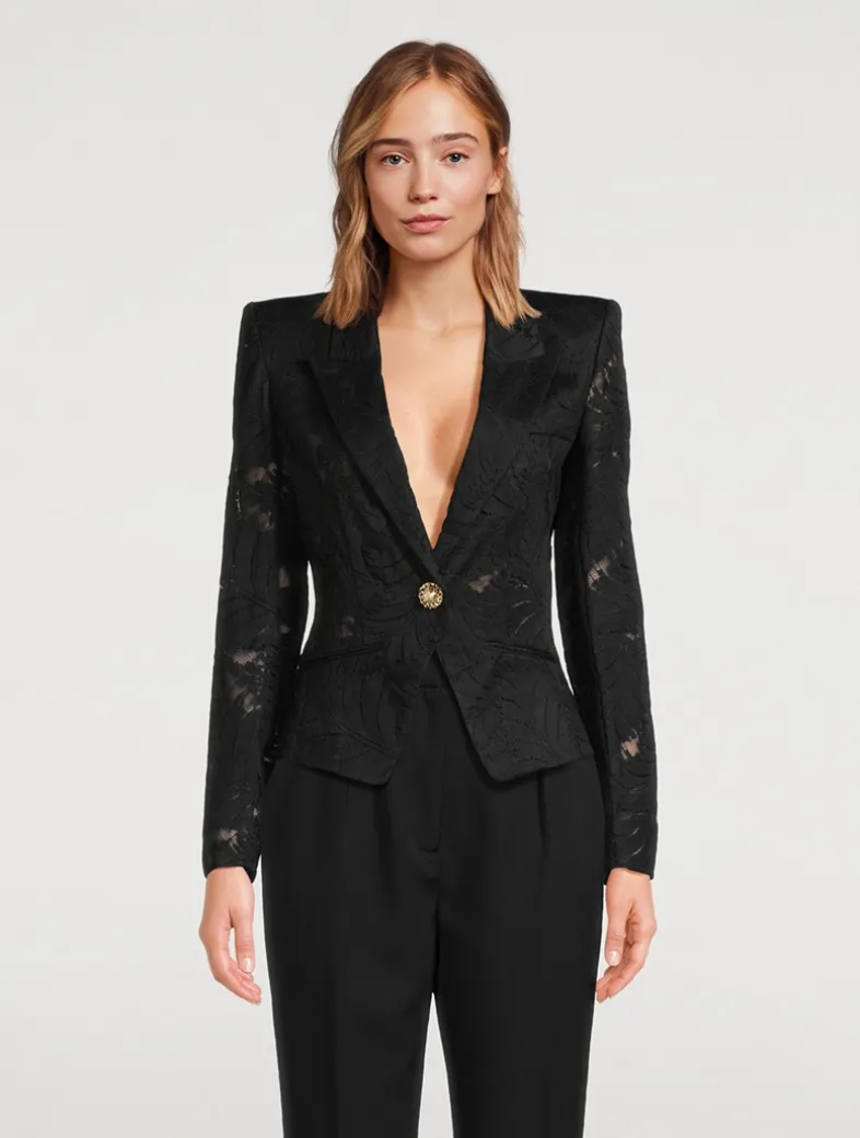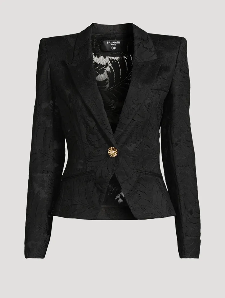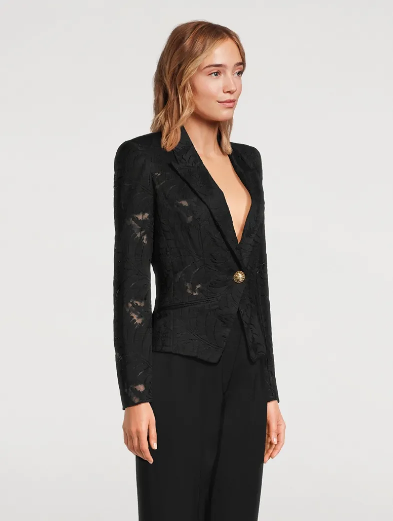 Balmain’s signature structured styling is mixed with a delicate floral lace construction in this single-breasted jacket. The topper has padded shoulders, a face-framing collar, and a non-functional pockets at the chest and waist.