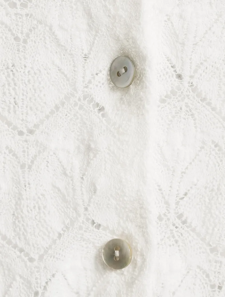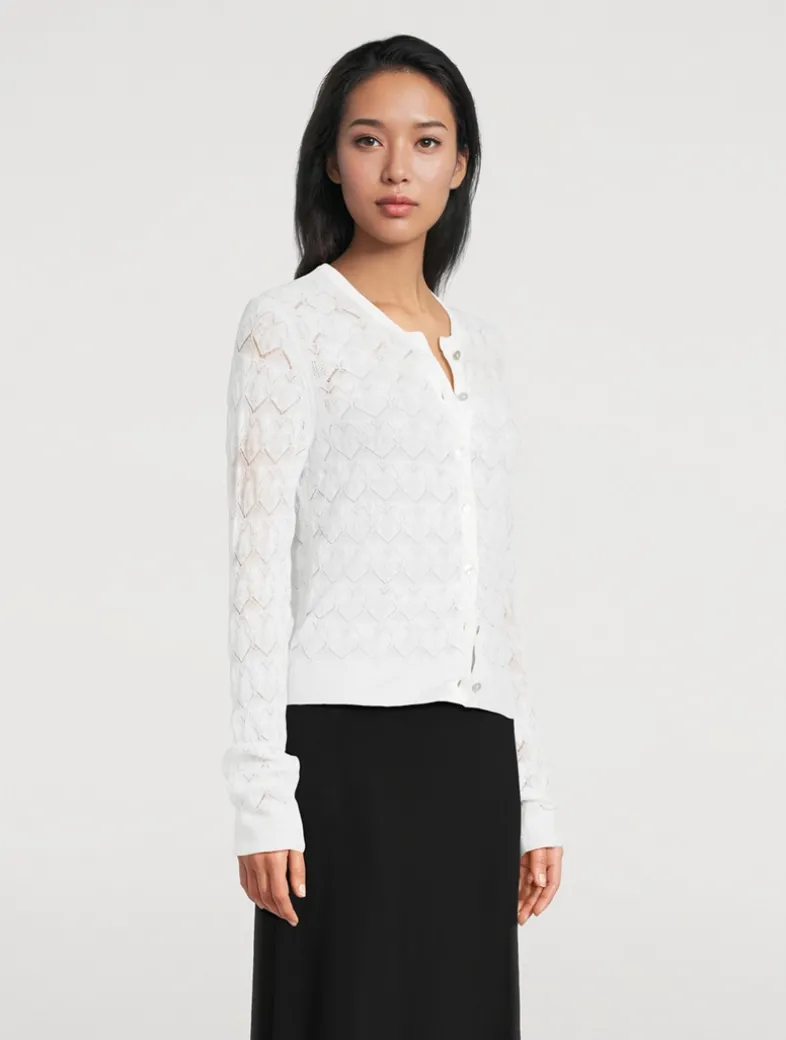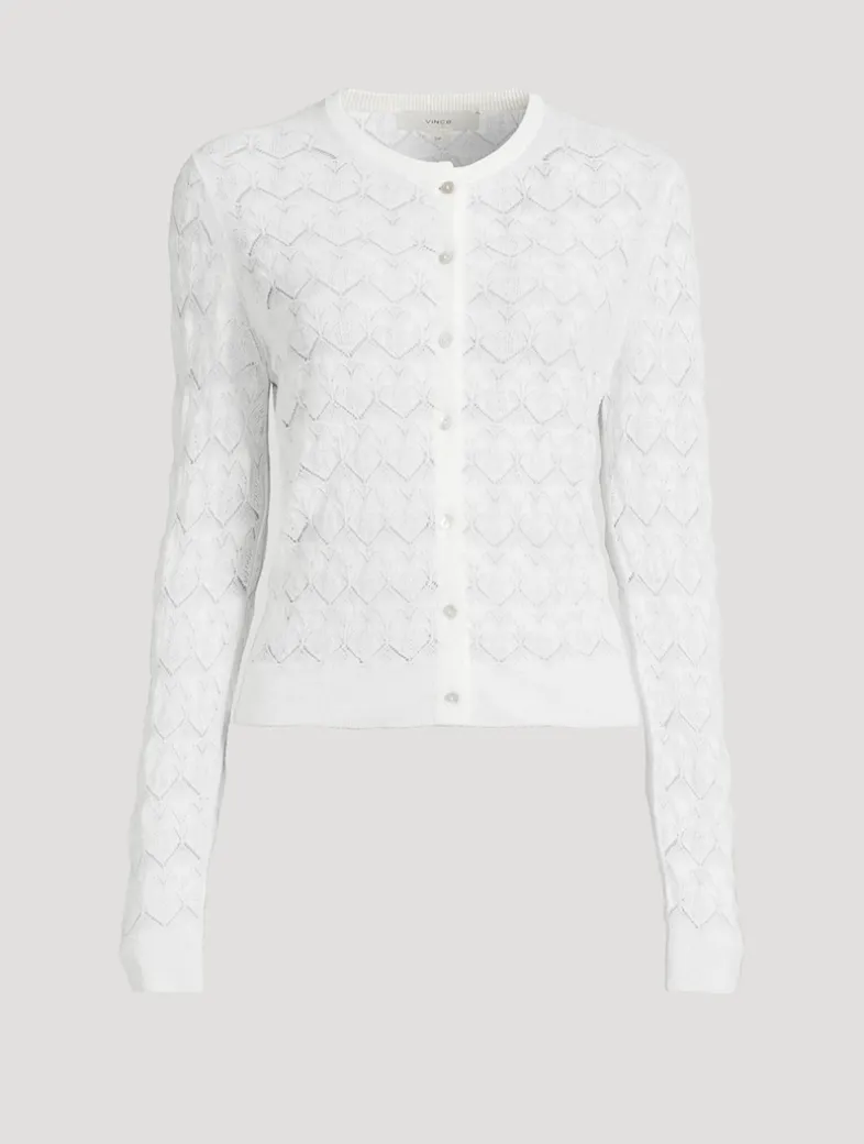 Deliciously soft and with a delicate pointelle design, Vince’s lace-texture cardigan features a ribbed crew neckline, a buttoned closure, and slim fit.