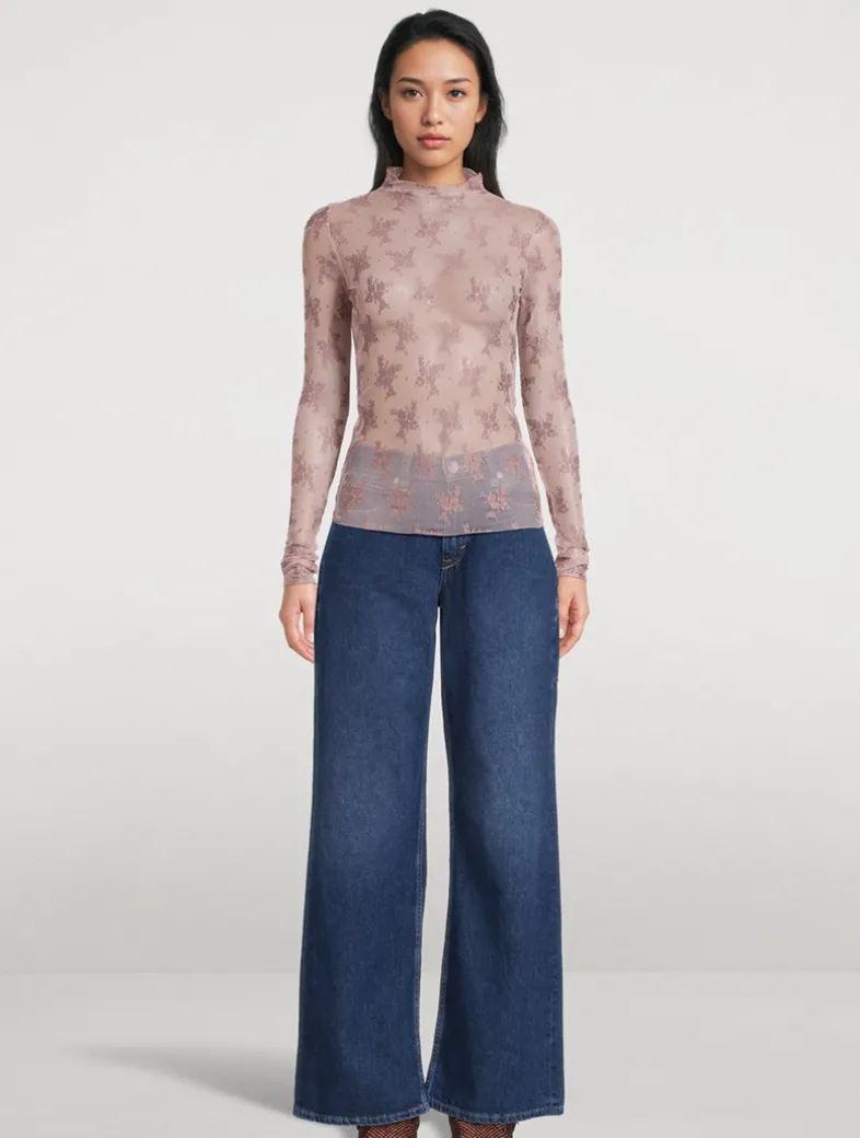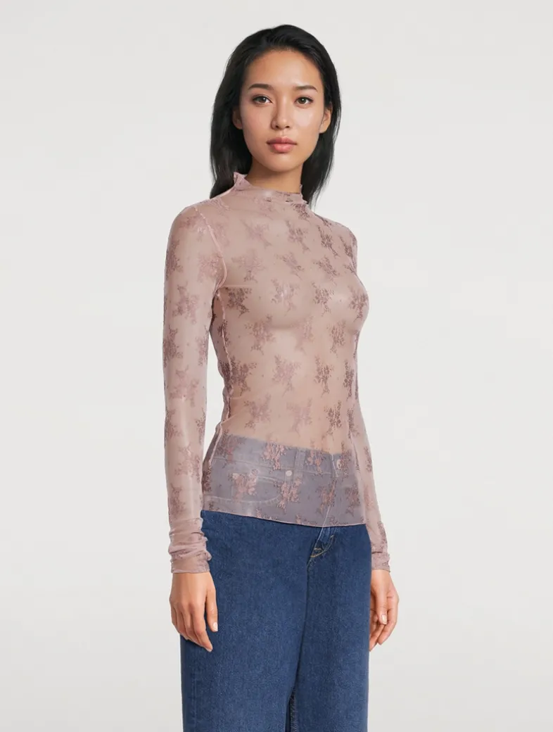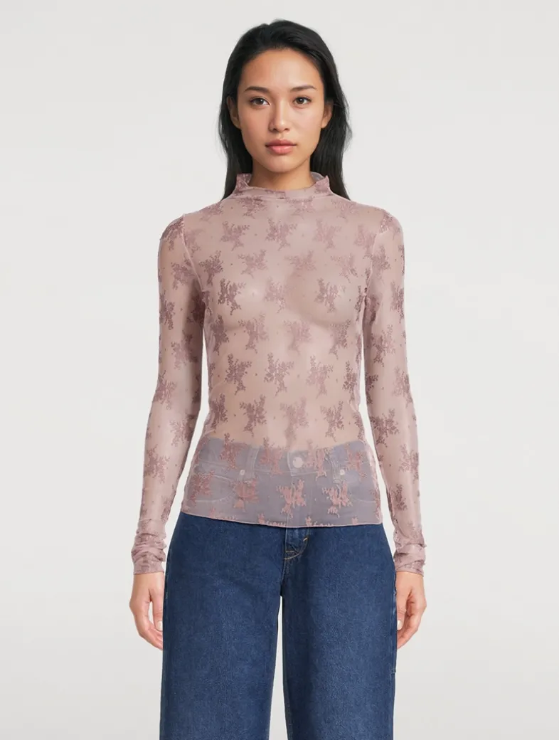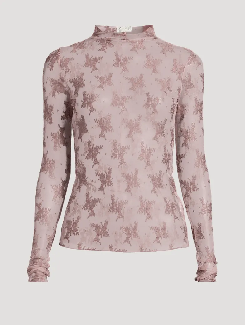 Perfect for layering, this sultry mesh top is featured in a sheer design with floral embroidery. It has a high neckline and long sleeves with thumbhole details.