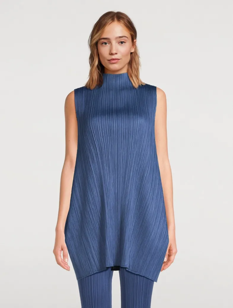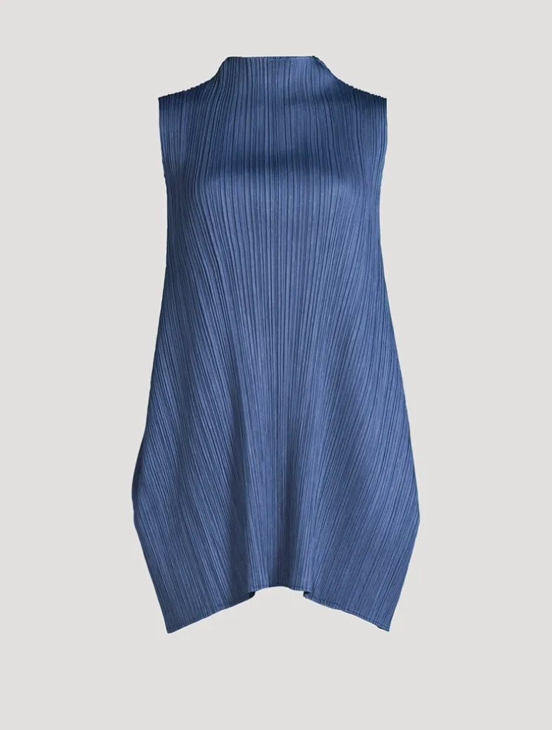 Inspired by its namesake, Lamp Shade features softly structured and draped forms achieved by turning the garments inside-out before pleating them. This sleeveless tunic has a mock neckline.