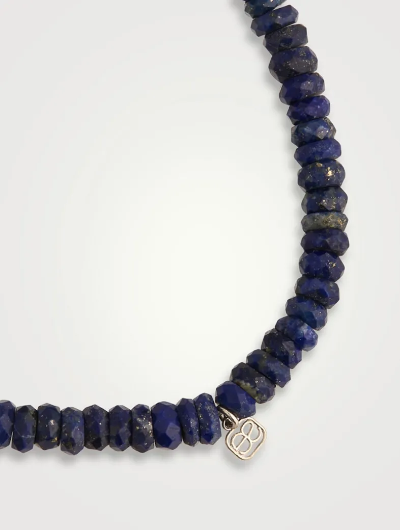 Strung with faceted lapis heishi wheel beads, this slip-on bracelet features a scallop edge rondelle charm with brilliant diamonds. All Sydney Evan beaded bracelets are strung on a stretch cord along with a 14k gold SE logo charm.