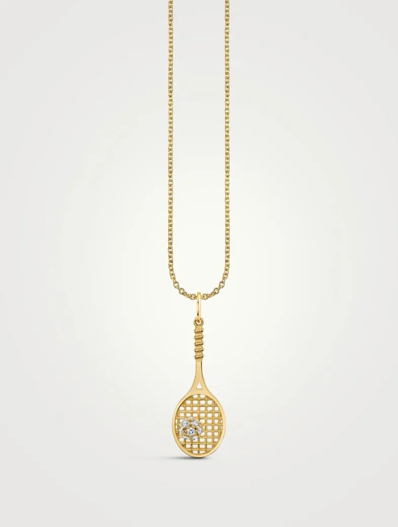This 14k gold necklace features a diamond-accented tennis racquet with a 20-inch adjustable cable chain.