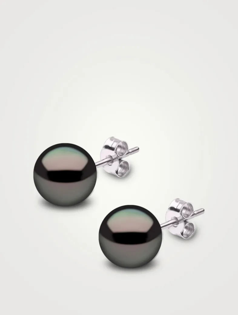 These stud earrings feature polished Tahitian South Sea pearls mounted on thin 18k gold posts.