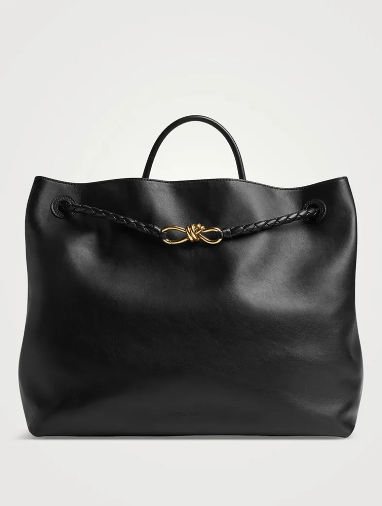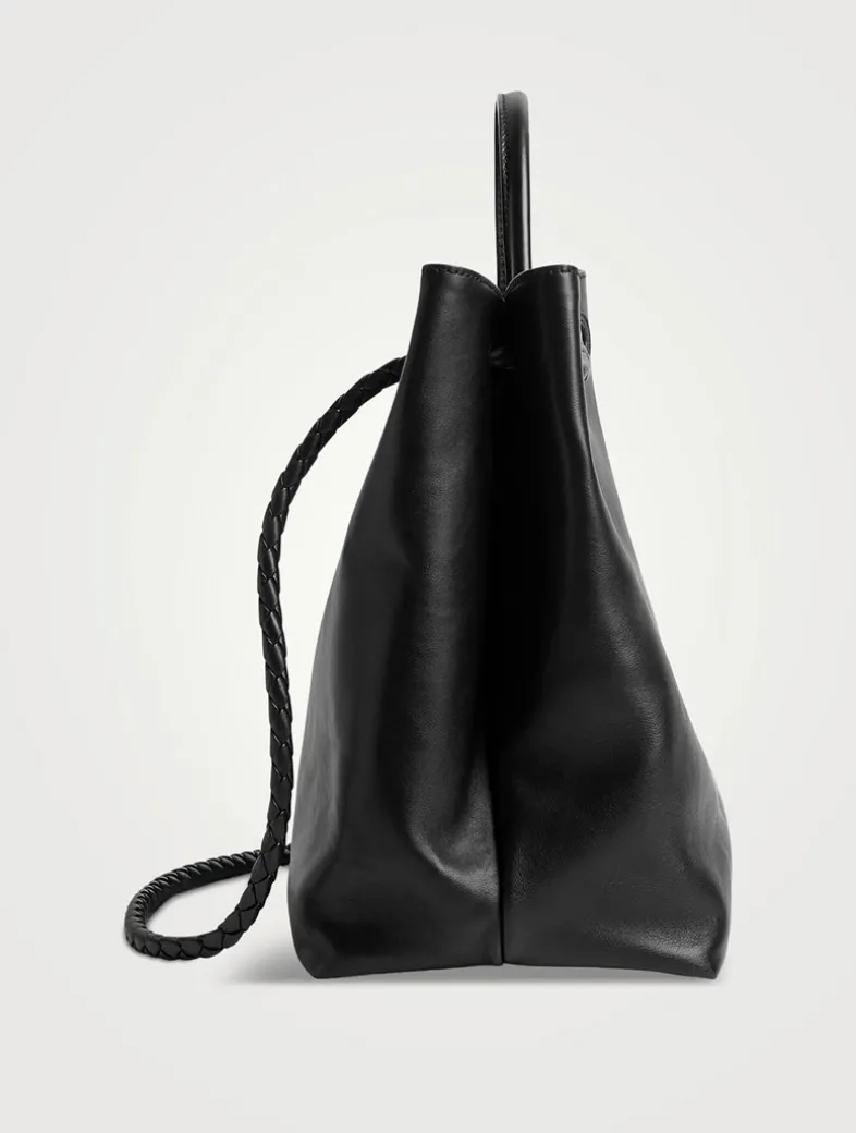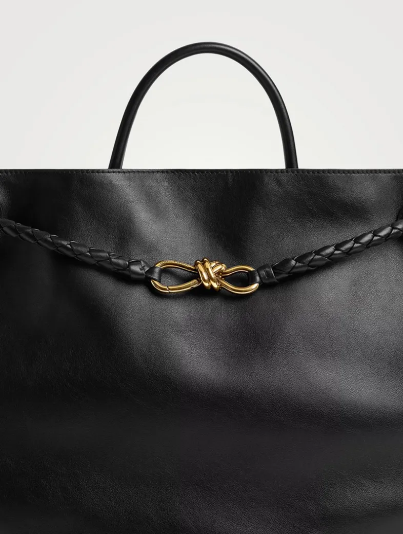 This top handle bag with a boxy silhouette is meticulously crafted from silky leather featuring an Intrecciato leather internal pocket and a sliding crossbody strap. Bottega’s signature knotted metal hardware completes the look.