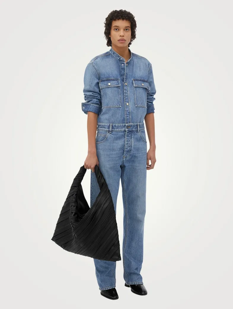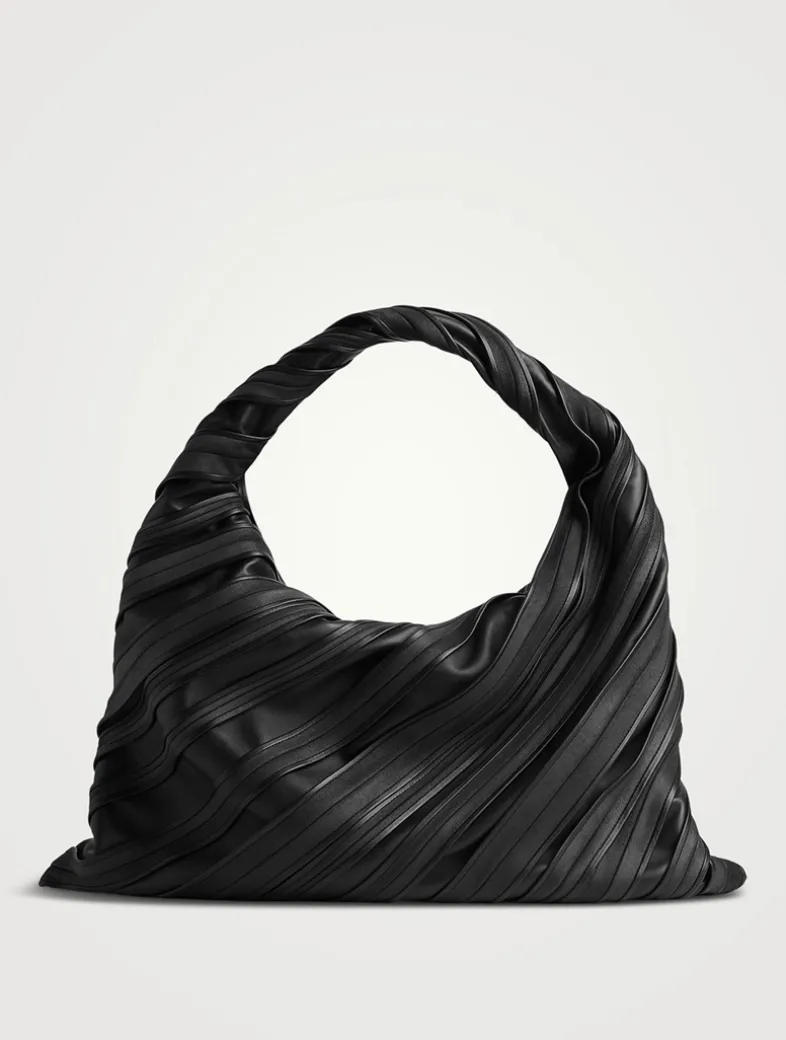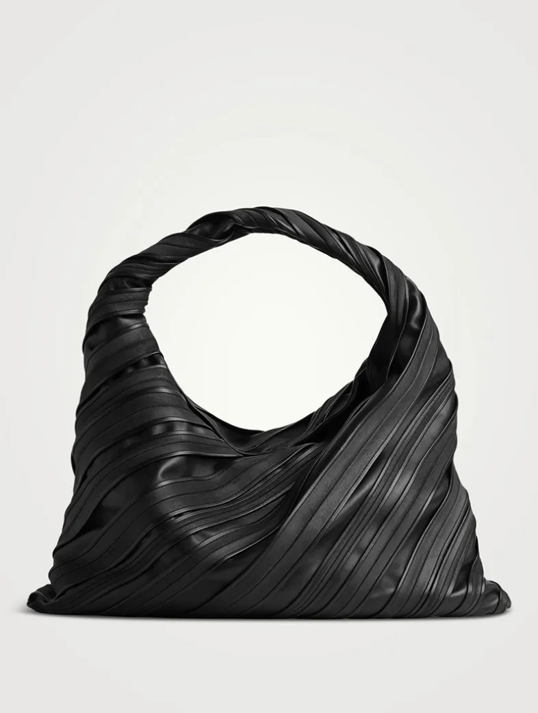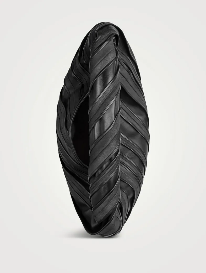 Realized with large leather patchwork stripes, this bag tucks neatly under the arm. Featuring a fixed shoulder strap, it has a single zippered pocket at the interior and a secure magnetic closure.